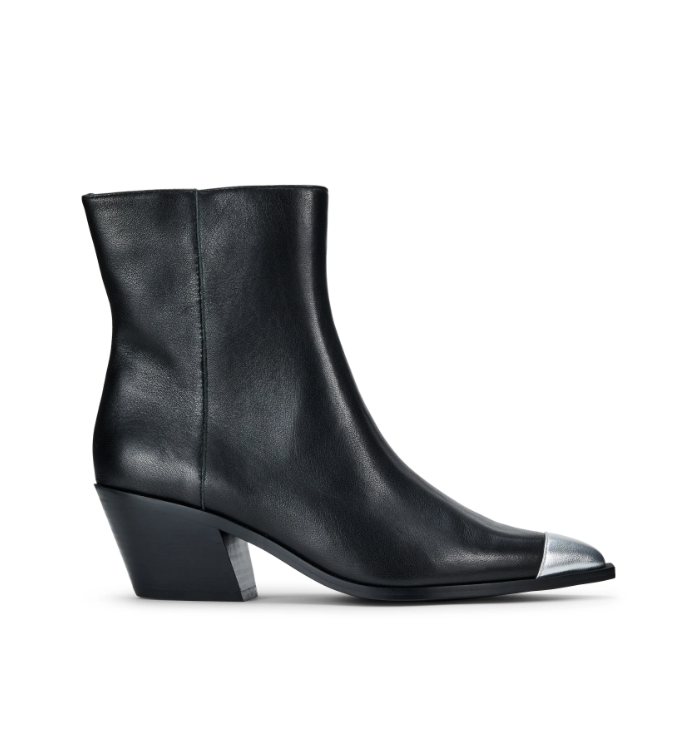 Meet Ashton — the elevated ankle boot that blends downtown edge with everyday sophistication. Crafted in smooth black leather and finished with a bold silver metallic cap toe, Ashton makes a confident statement from day to night. The sculpted heel and pointed toe create a flattering silhouette, while the side zipper ensures an easy, secure fit. Pair with denim, dresses, or sharp tailoring — this boot is made to stand out.