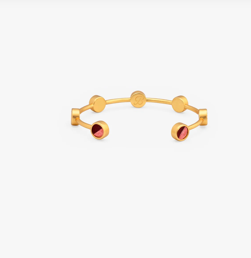 The Brittany Multi-Bezel Cuff is a dainty statement designed for everyday wear. Color-blocked bezels feature ivory, champagne, and rust-dyed goose feathers, accented with a pop of coral peacock sword for subtle texture and dimension. Finished in 18kt matte gold plating, this lightweight cuff adds an easy touch of polish - perfect for stacking or wearing solo for a refined look.