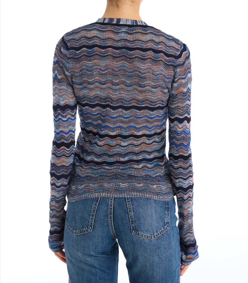 Designed in our exclusive spacedye knit, the Colleen Cardigan is an instant favorite. The lightweight viscose yarns have a blue monochromatic tone. The V neckline leads to center font buttons and features a slim fit through the sleeves and body. Slightly sheer; modeled with nude undergarments.