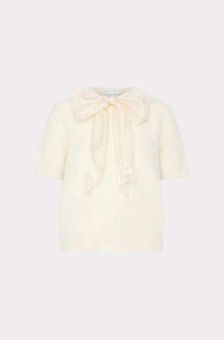 Milly Combination Bow Short Sleeve Fuzzy Sweater Ecru