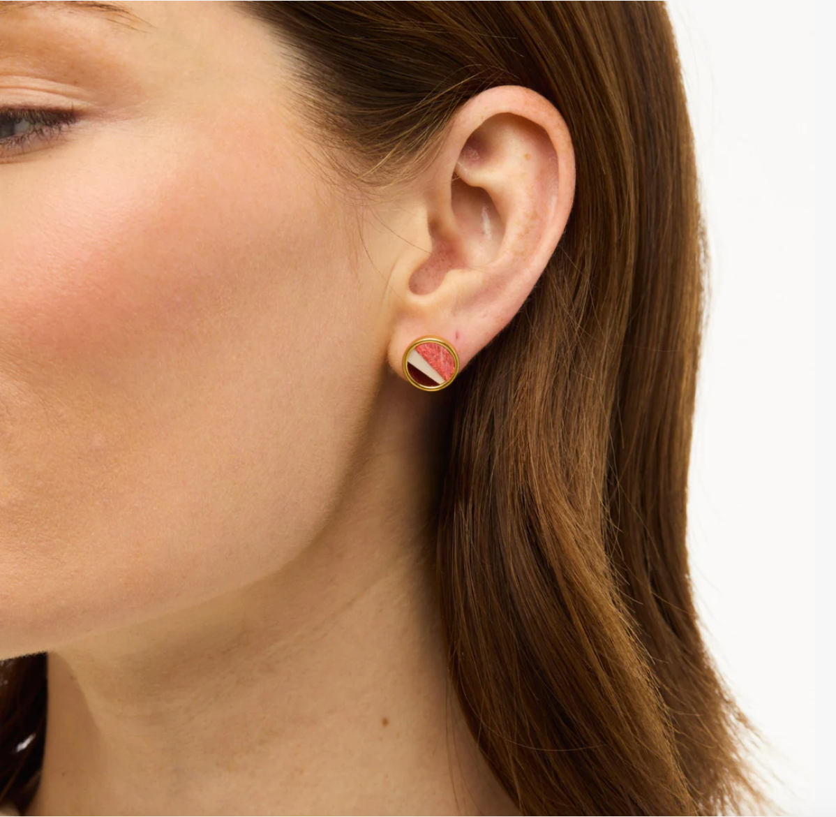 The Elizabeth Bezel Jacket Earring offers two looks in one, blending versatility with Brackish artistry. Handcrafted with ivory- and rust–dyed goose feathers, accented by coral peacock sword and grounded with green rooster feathers, the mirrored stripe feels modern yet organic. Finished in 18kt matte gold plating, wear the stud alone for everyday polish or add the removable jacket for a bolder, statement-making moment.