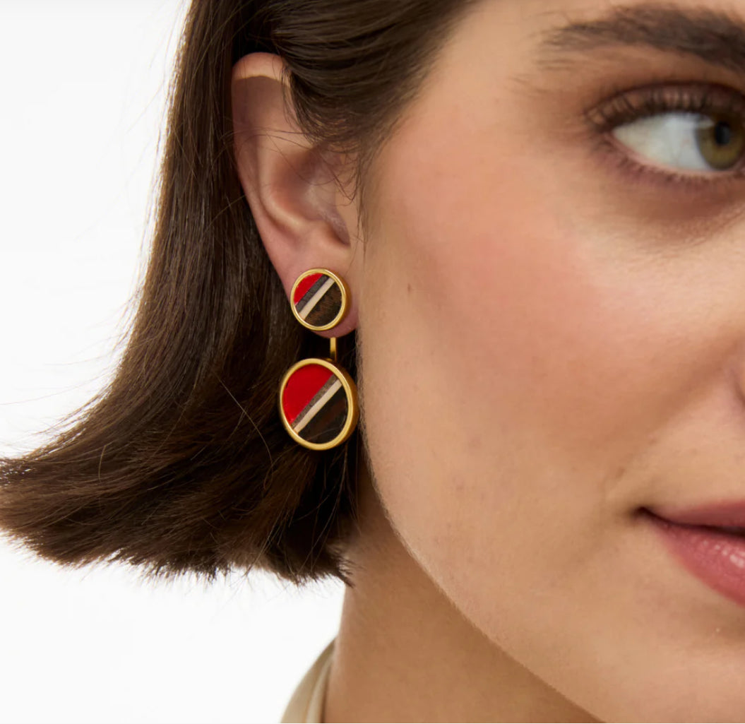 The Hazel Bezel Jacket Earring blends modern structure with bold, organic pattern. Featuring layered goose and turkey feathers, this design creates a striking graphic stripe effect in a mirrored layout, offering visual balance and depth. Wear Hazel as a standalone stud for a clean, understated look - or add the feather jacket for a bolder, more dimensional statement. With its artful contrast and sleek bezel setting, Hazel moves effortlessly from minimal to eye-catching.