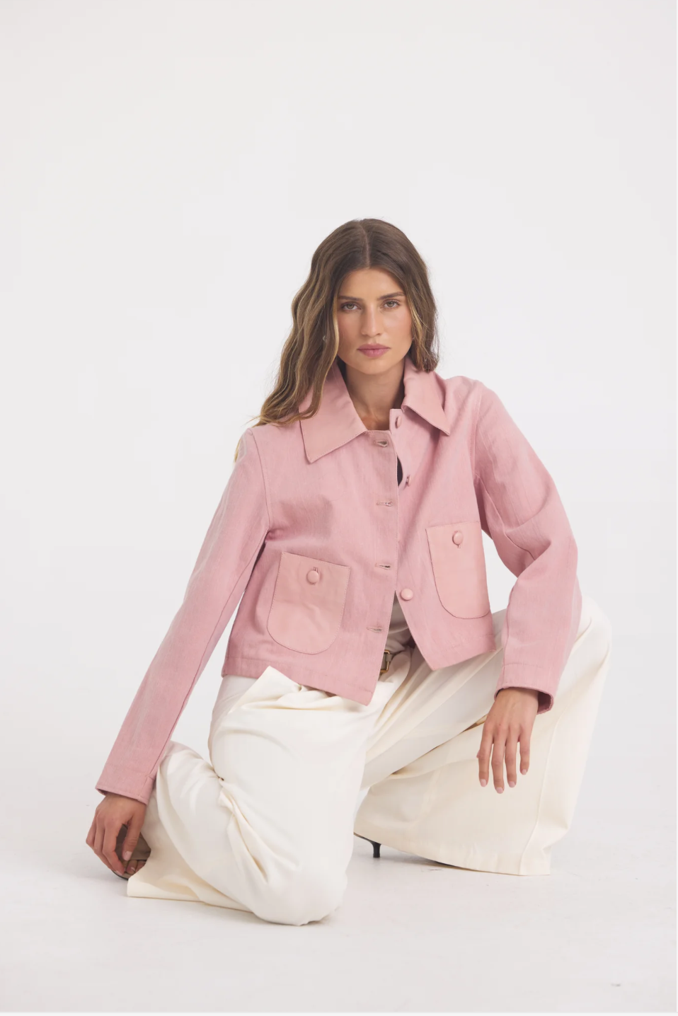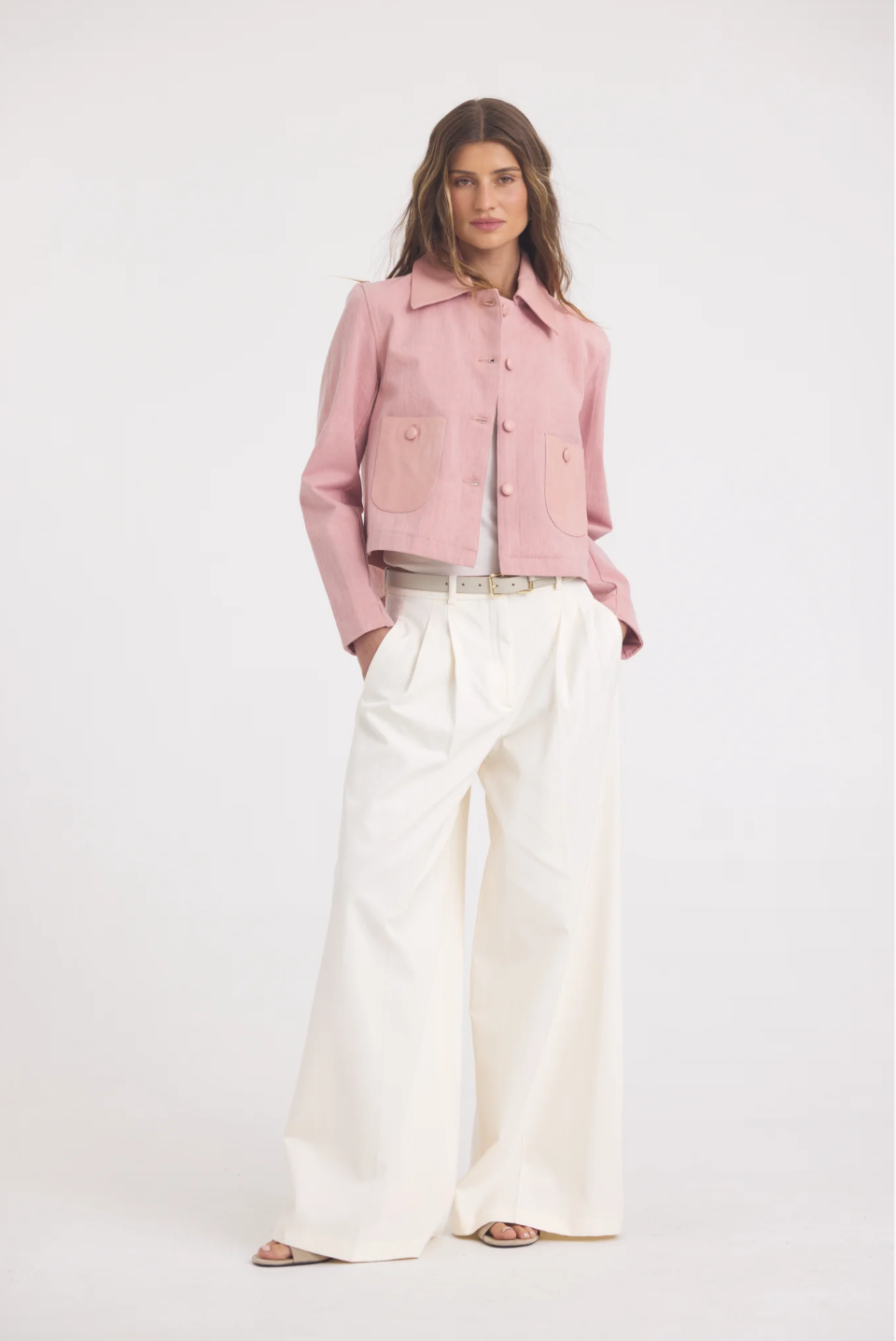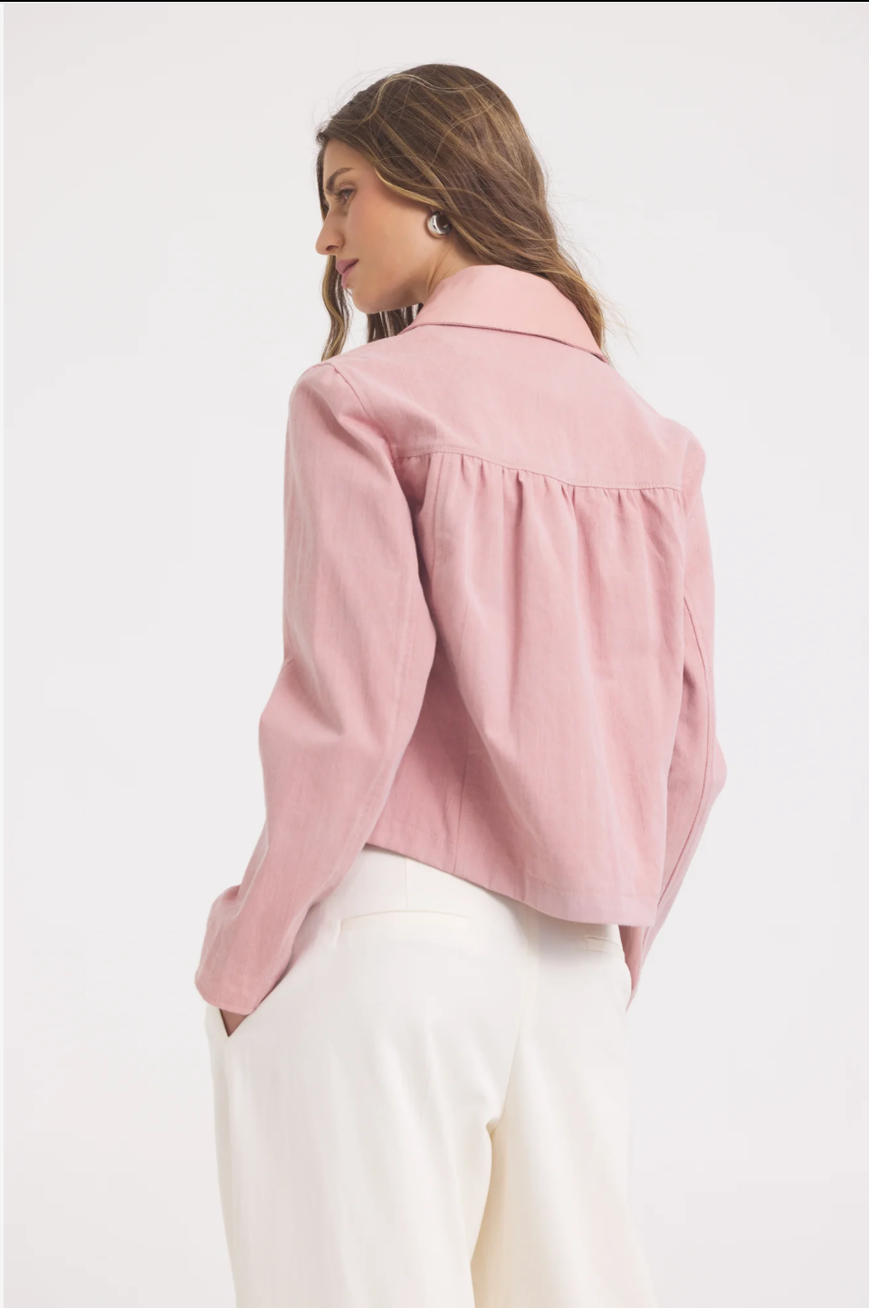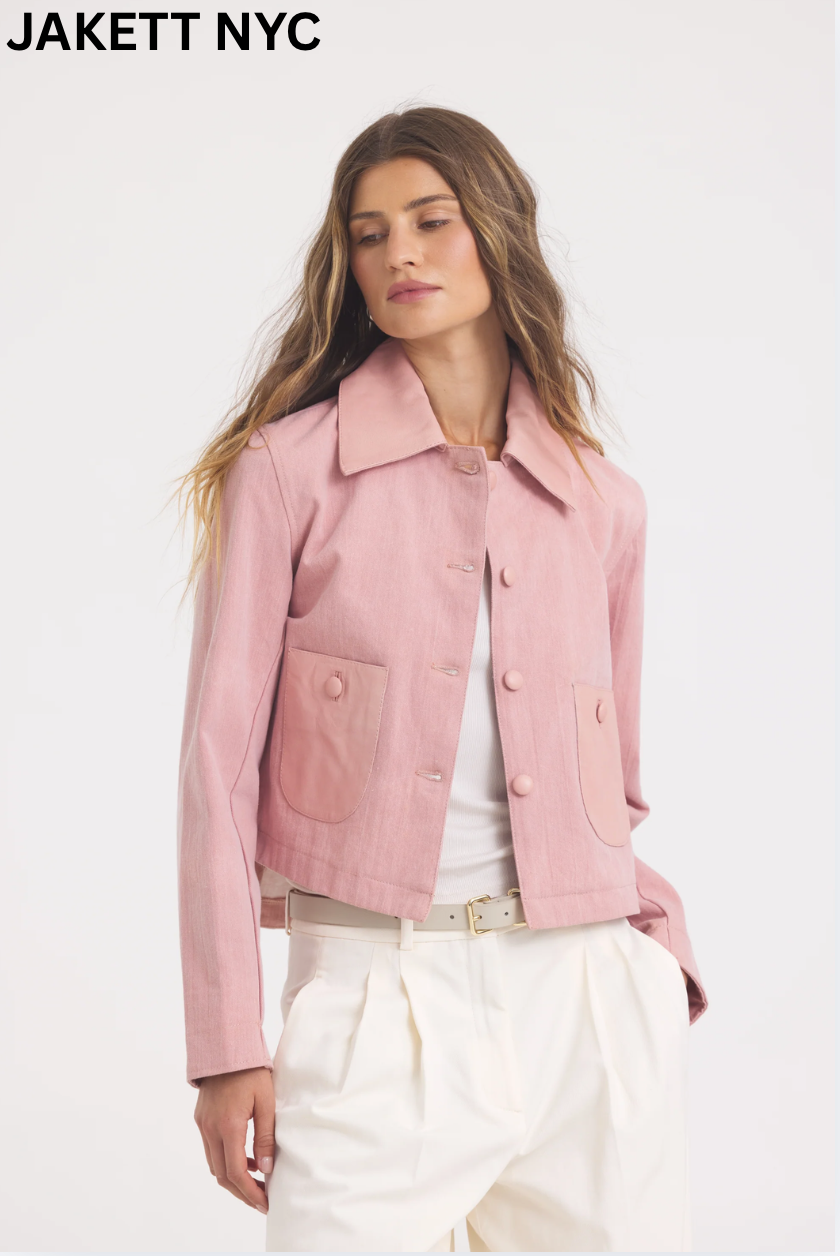 A cropped jacket featuring chest patch pockets, jean detailing, and frayed sleeves and hem. Pair with a midi slip dress for a romantic take on a classic look.