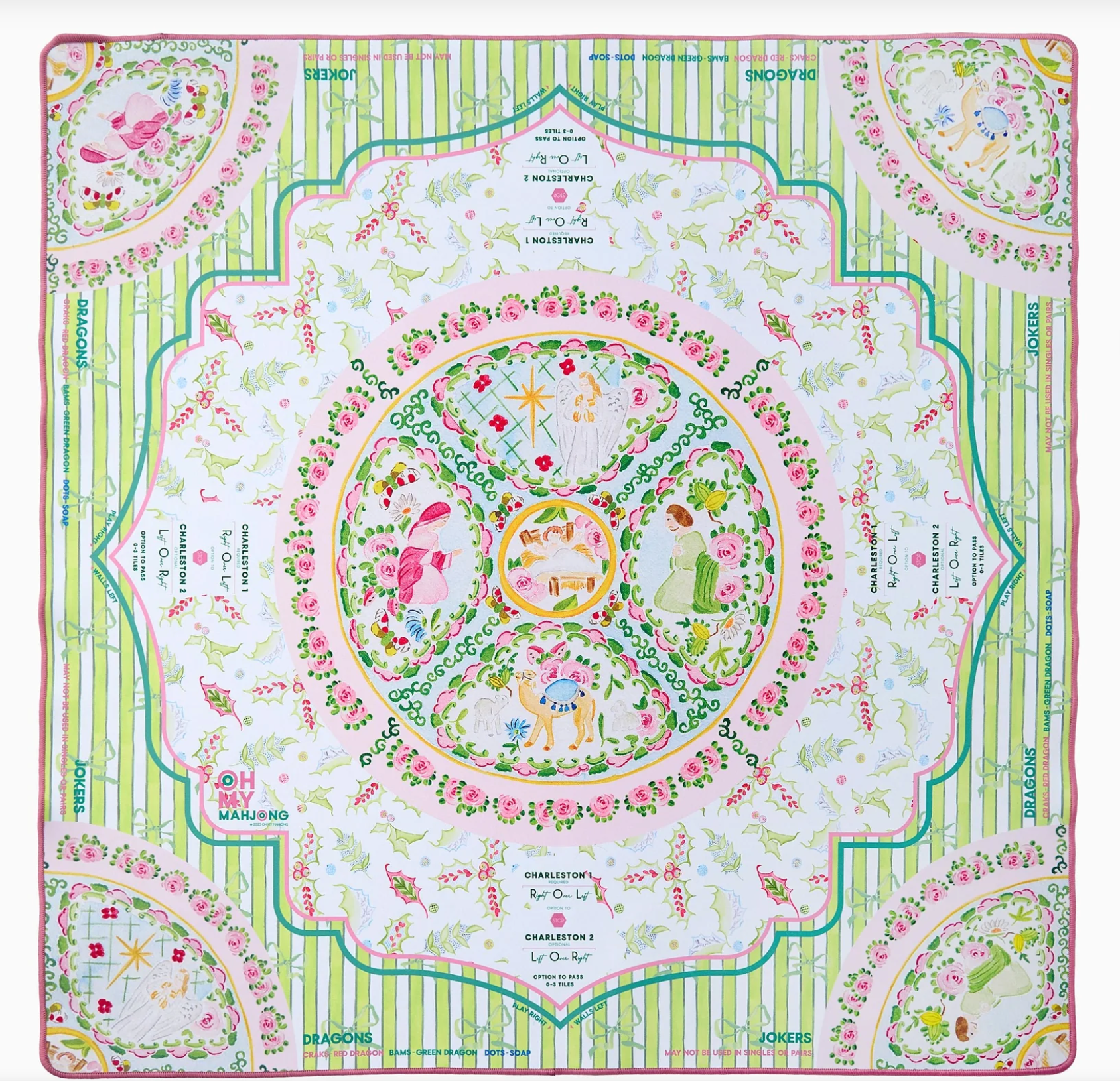 Bring a touch of serenity and sweetness to your holiday season with the Silent Night Mat, a graceful collaboration with Fort Worth-based watercolor artist Catherine Cartie. This mat is a feminine dream, featuring delicate depictions of the Nativity, the guiding North Star, and perfectly placed rosettes that tie the story together. Soft shades of airy pinks and greens create a peaceful, light-filled backdrop, making this mat a timeless piece to add to your tablescape year after year.