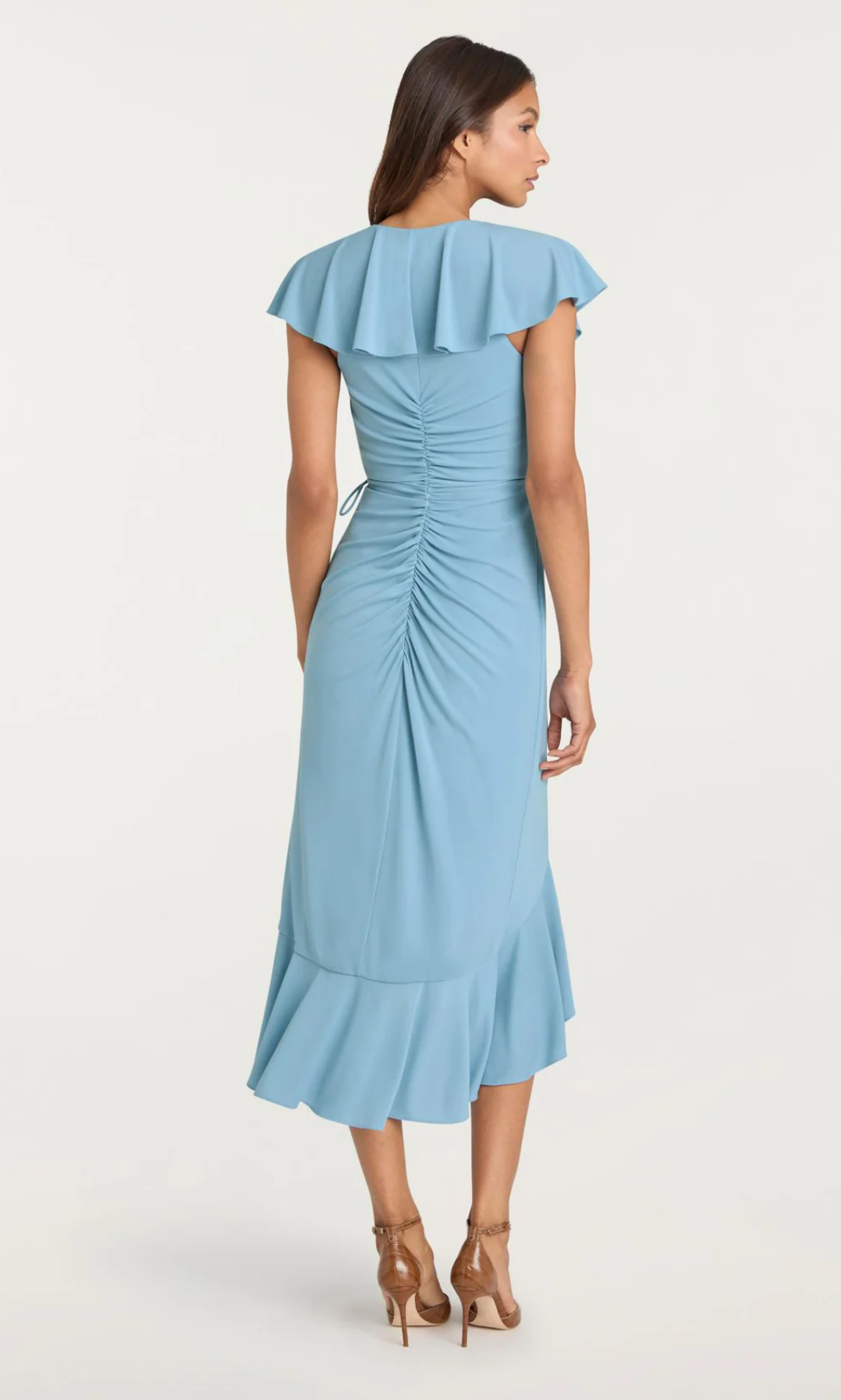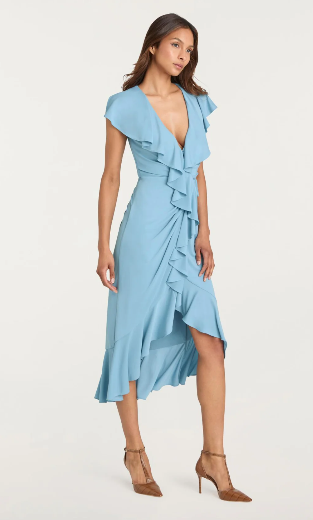 Meet the Malak Dress, a sophisticated piece that balances elegance with movement. The dramatic high-low hemline pairs with delicate ruffles for an eye-catching finish, while the deep V neckline and wrap tie waist offer a flattering, customizable silhouette. Crafted in fluid fabric with short cap sleeves, this midi dress transitions seamlessly from brunch to evening events.