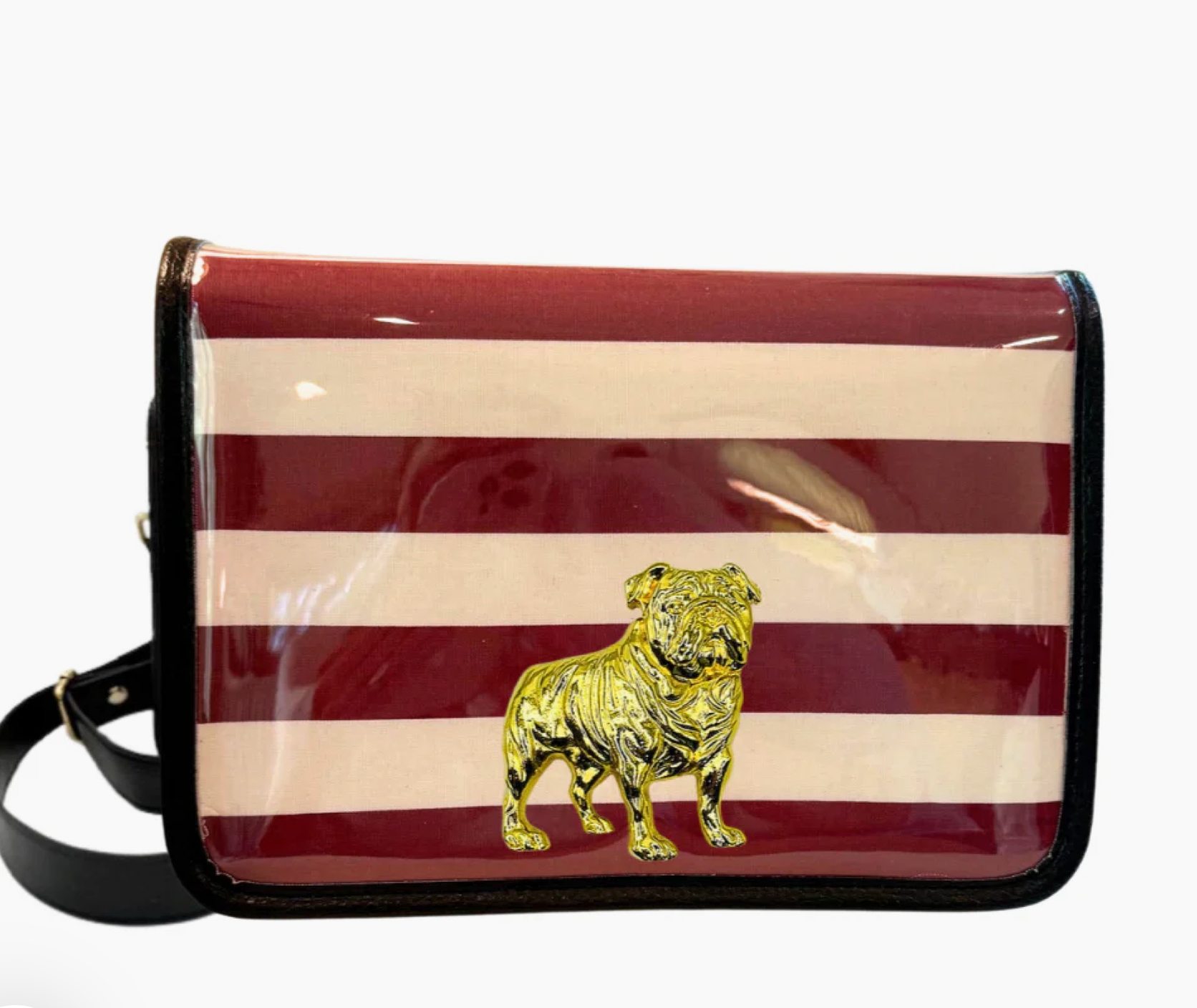 It's clear...that this is the perfect stadium bag! Meeting all standard stadium requirements with 3 of its four sides transparent, this crossbody stadium bag makes a statement like no other! The bag features a front flap in a maroon stripe pattern, with a maroon reverse (visible through the rest of the bag). It is adorned with a gold bulldog, and is trimmed with black faux leather. It comes with an adjustable, coordinating faux black leather strap that is removable. The interior boasts a generous built-in pocket, and a magnetic snap closure. The bag dimensions are 9x5" x 6" x 2.5".