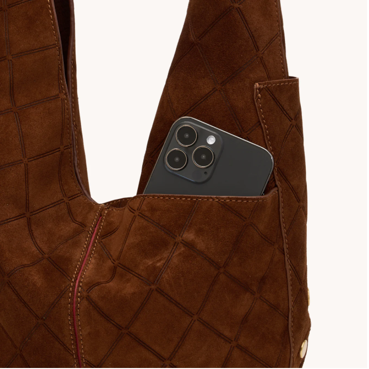 • Crafted with a deep brown Italian suede with a unique doubled diamond embossing effect and deep brown pebble leather accents