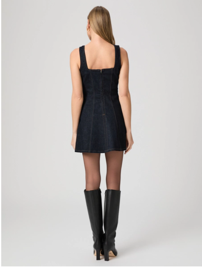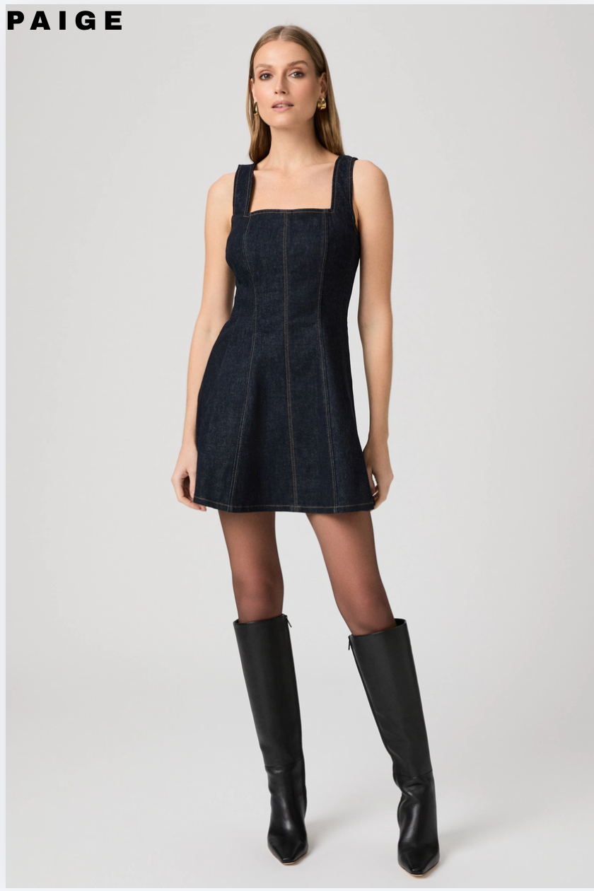 Perla is a modern take on the denim mini dress, crafted in an elevated dark wash with just the right amount of stretch for all-day comfort. This fit-and-flare silhouette features a flattering square neckline, a back zipper, and contrast seaming that adds structure and style. Effortless and feminine, it’s the kind of piece you’ll reach for all season long.