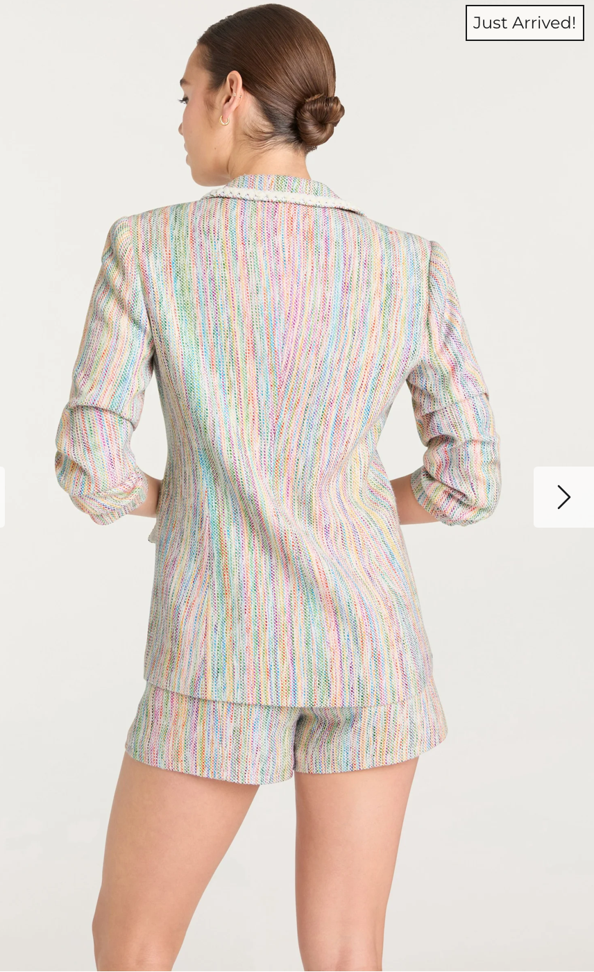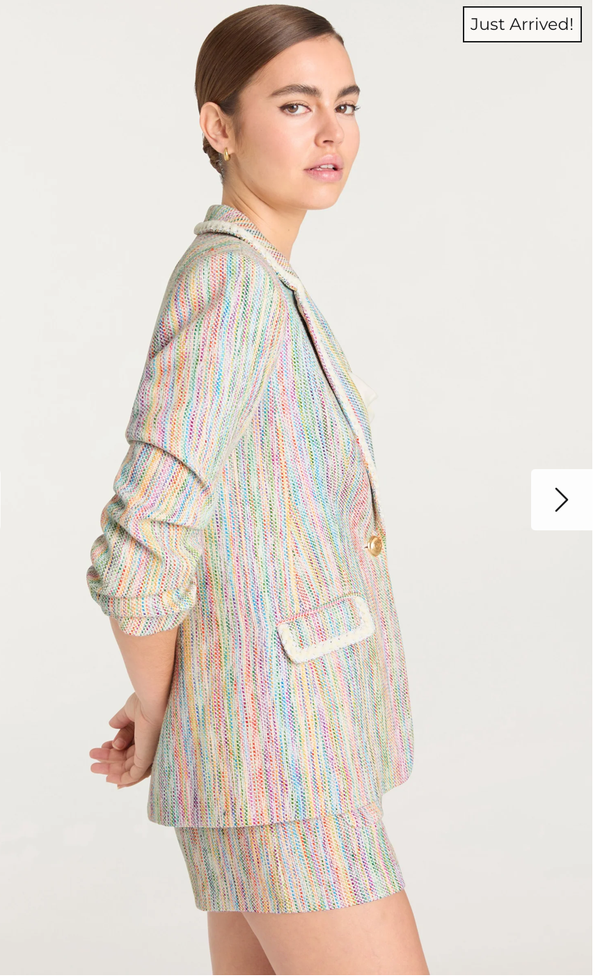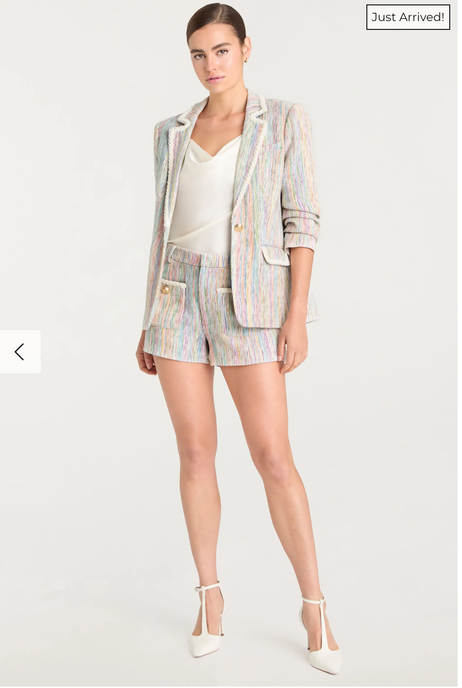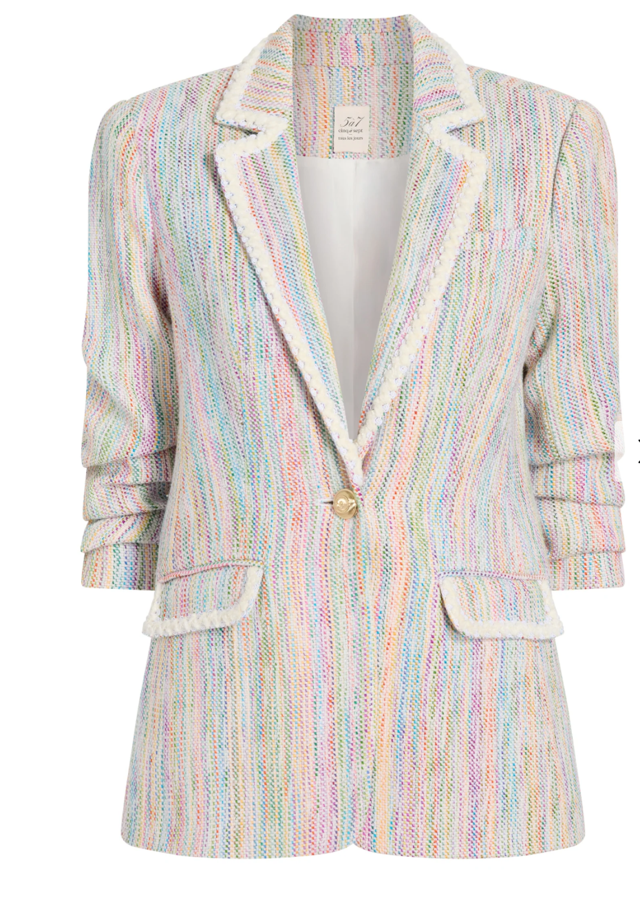 The Khloe blazer offers a playful twist on the classic blazer. Its prism tweed fabrication makes a great contrast against the solid edges of its collar and pockets.