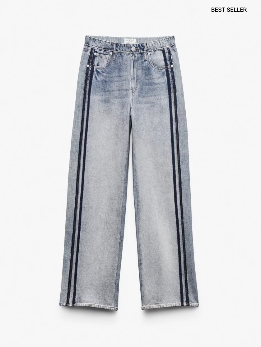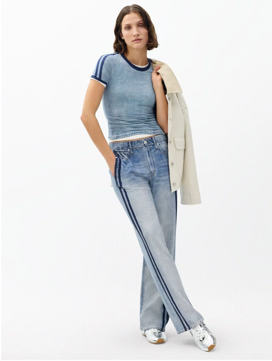 Miramar, our revolutionary printing technique, makes any material look like denim. These wide-leg track pants are cut and sewn from cotton terry cloth that's ultra-soft on the inside and printed on the outside to look like your favorite jeans. Featuring a pull-on elastic waistband and hidden side-seam pockets, the mid-rise style further achieves its comfortable fit and feel with its sporty side stripes, other pockets, and denim details digitally printed on the fabric.
