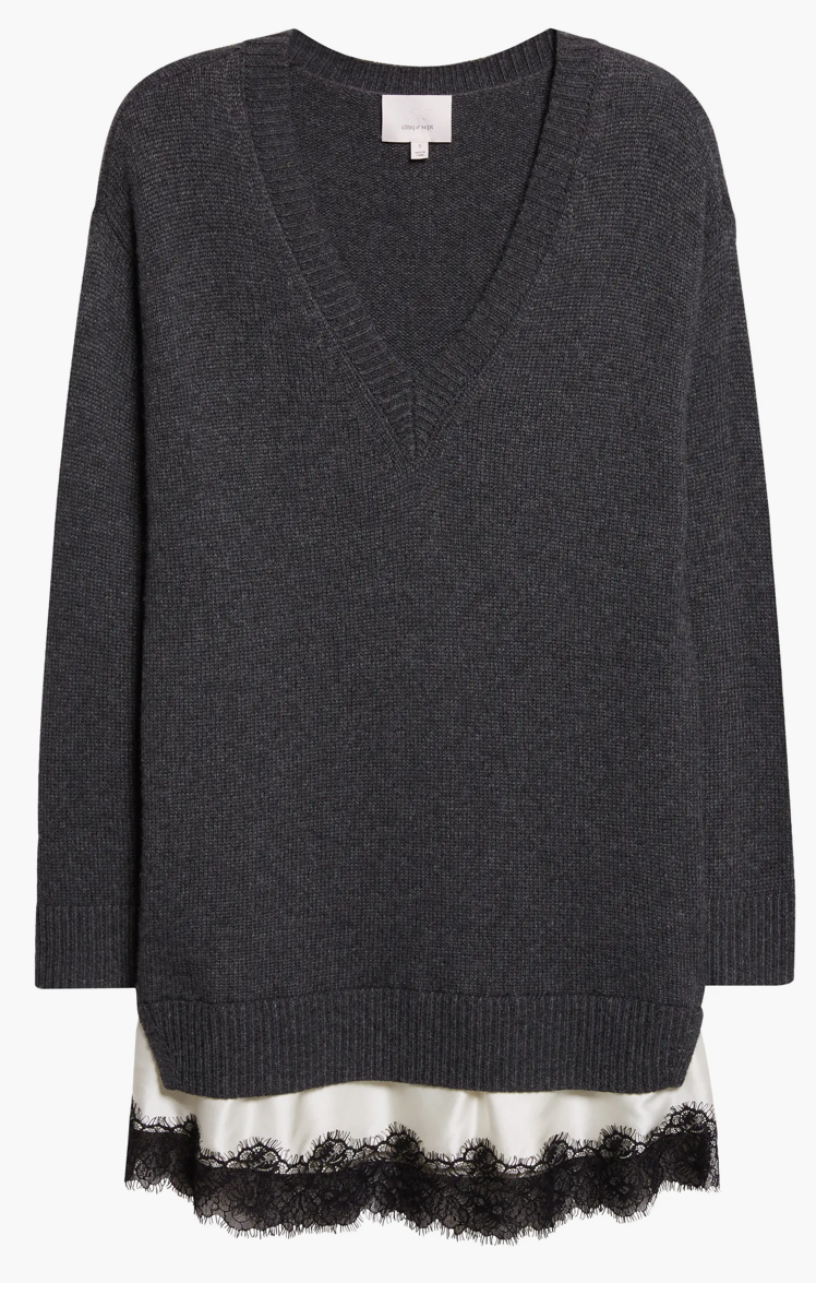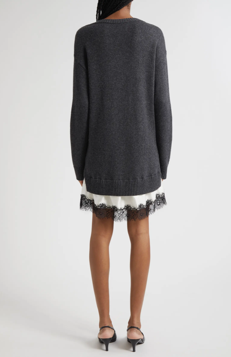 A satiny lace-trimmed hem romances this woolly cashmere-kissed sweater-dress framed by dropped shoulders for a relaxed fit.
