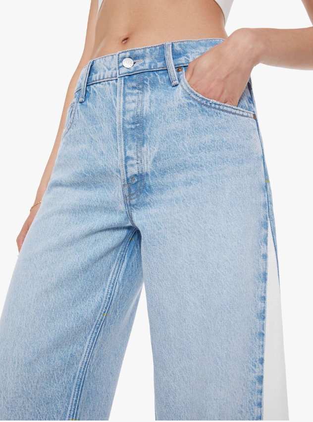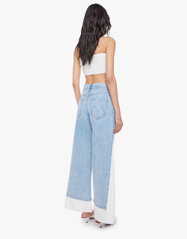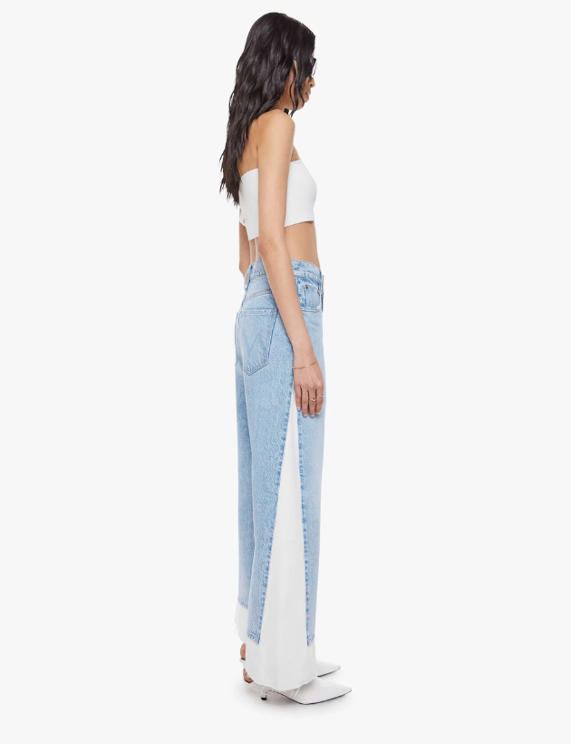 Wide-leg jeans from SNACKS!, a collection of unconstrained silhouettes leaning into exaggerated shapes and extreme proportions. Experimental and non-era specific. For everyone, or not. The high-waisted jeans are designed with a button fly, low-slung fit, 30-inch inseam and a loose wide leg with inset panels on the outer seams. Made from a rigid recycled cotton blend, Deep Fried is a light blue with white panels, pretzel-detailed button and candy-inspired interior rivets. Would you like a treat?