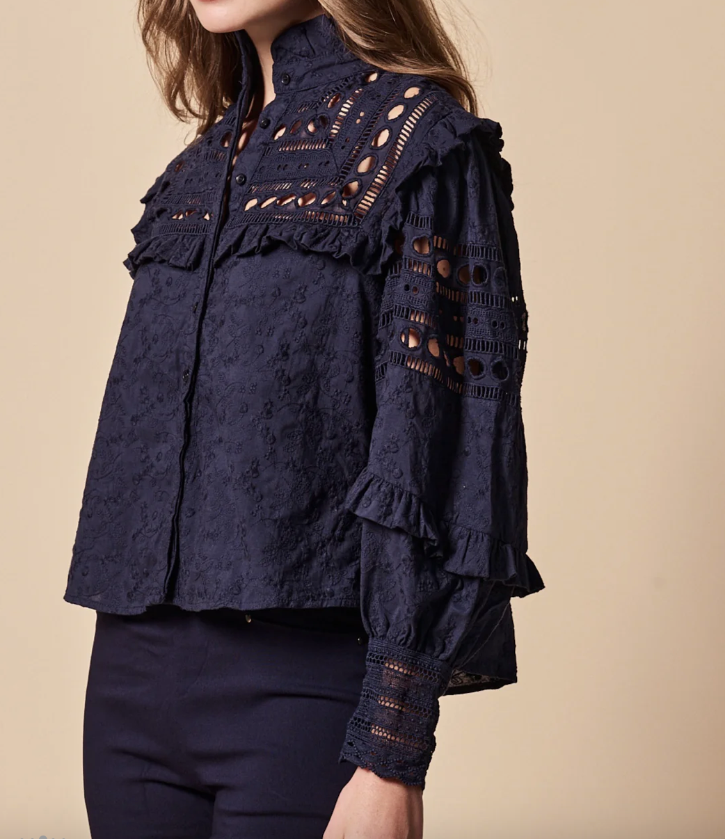 Our Danielle Shirt is constructed in super luxe textured cotton with lace inset details and crochet trim. A slight a-line shape flows away from the body.