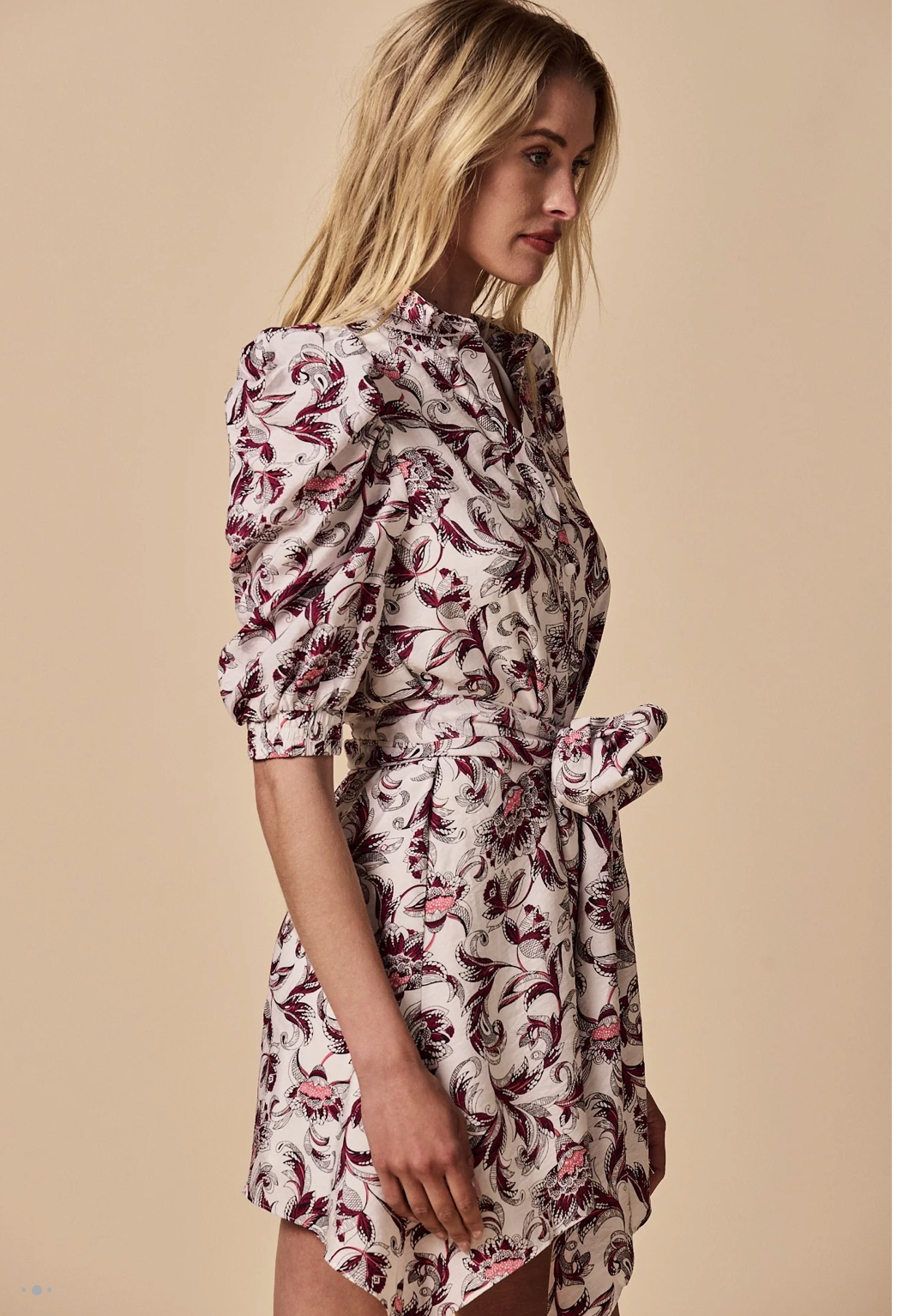 A ruched dramatic shoulder and in our dramatic eye-catching prints. With a cinched tie