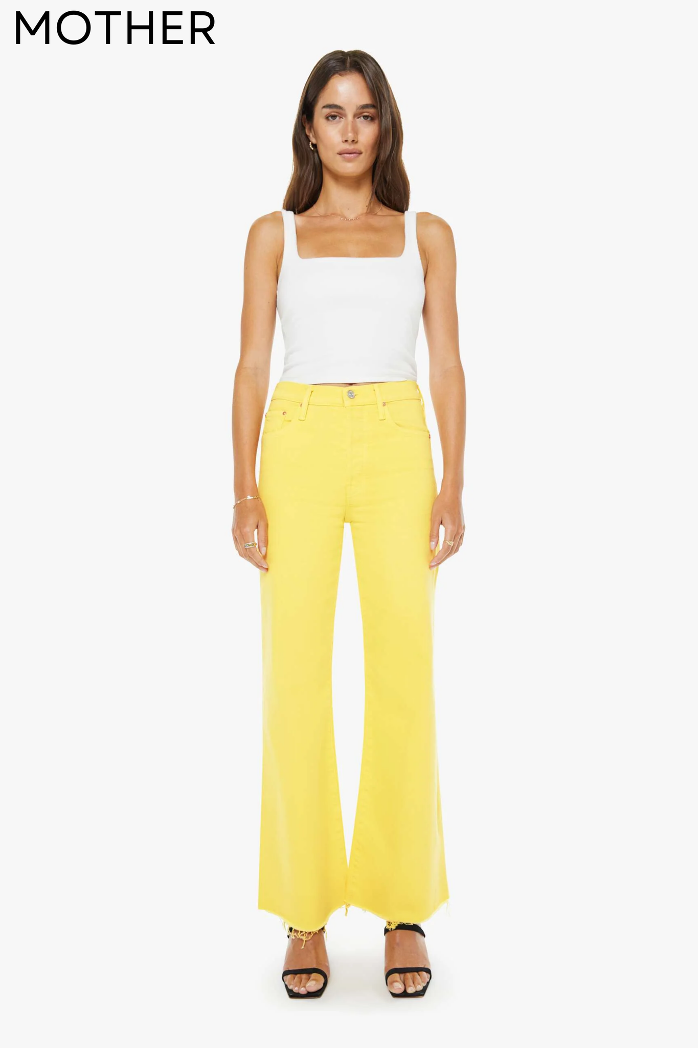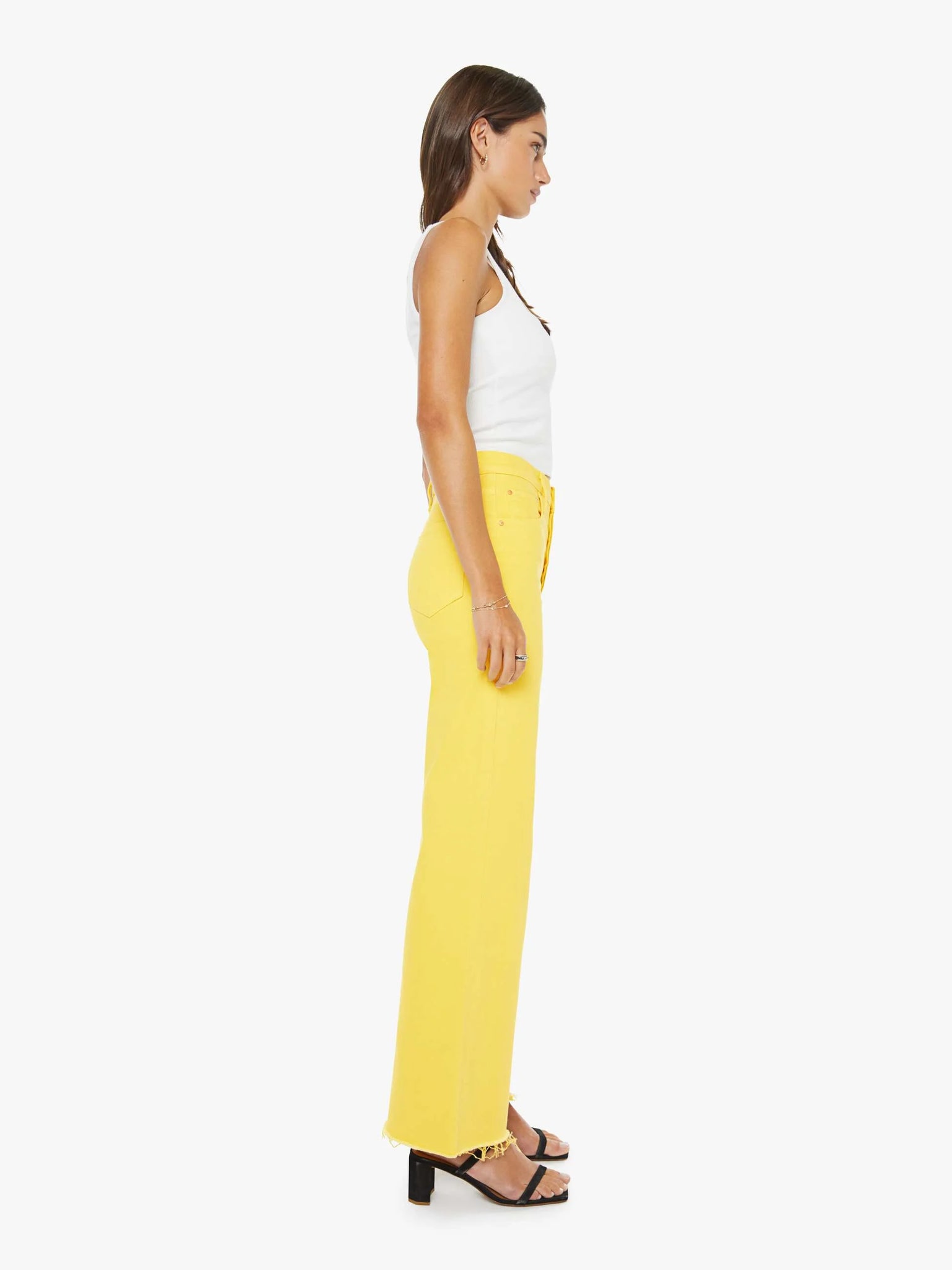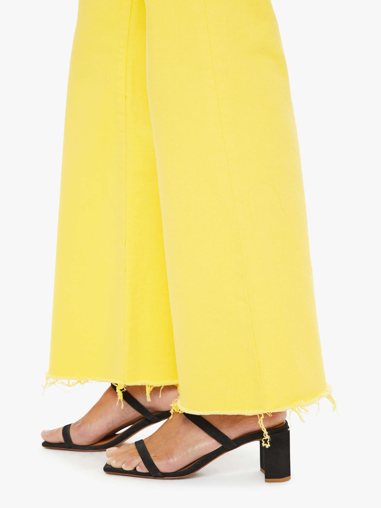 Sunny side up. High-waisted wide-leg jeans with a button fly, 31-inch inseam and a frayed hem. Made from rigid SUPERIOR denim, Sunshine is a bright yellow with subtle fading at the knees.
