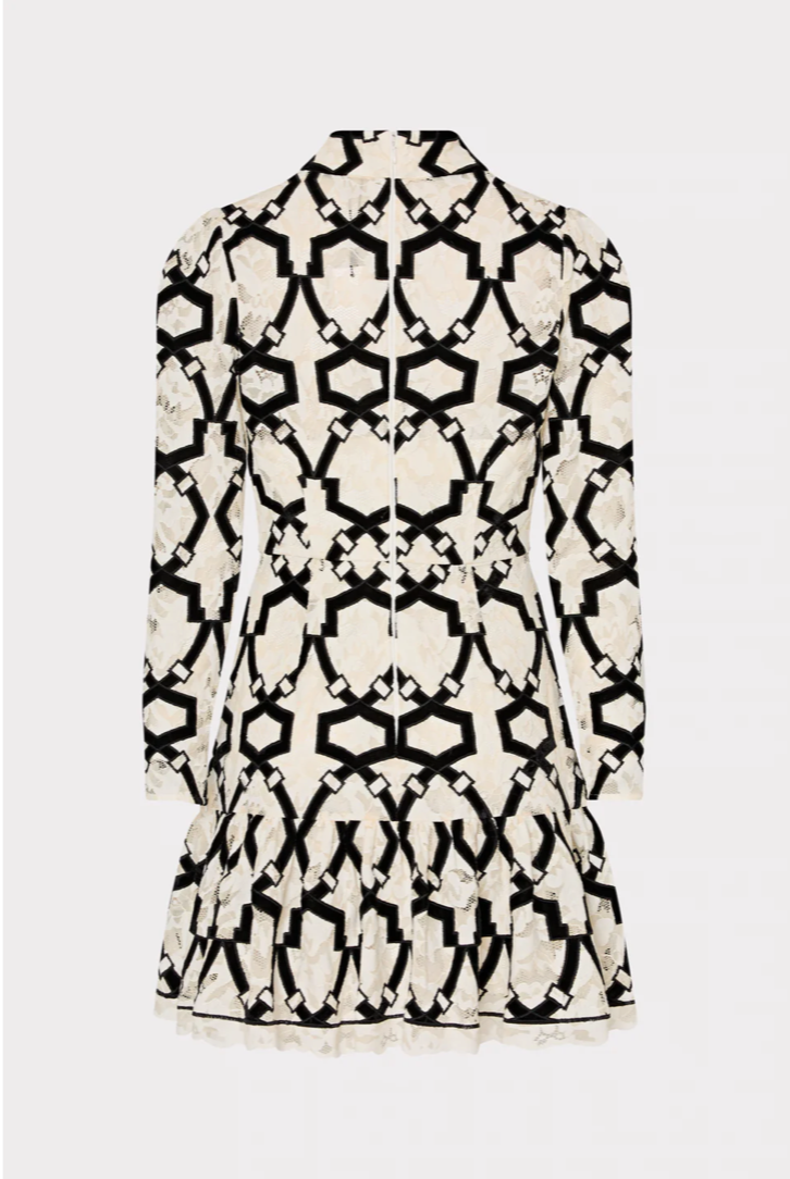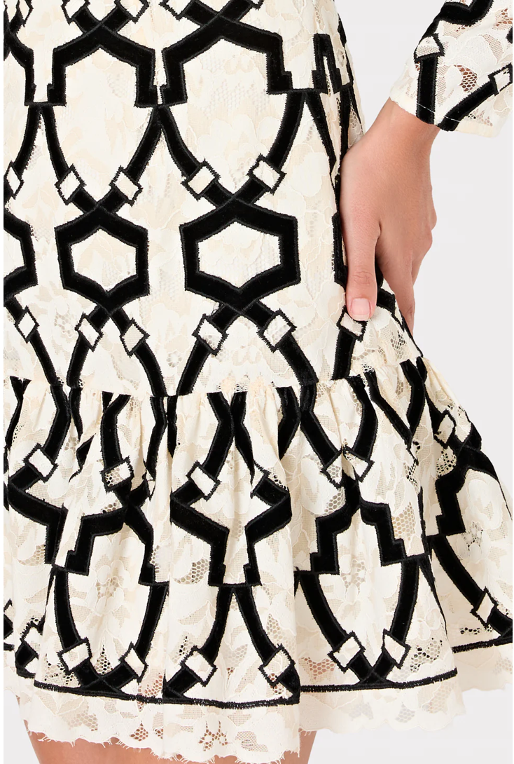 Rendered from delicate white lace, this long sleeve dress style is contrasted with a bold, black velvet geometric print throughout. It’s designed with a modest mock neckline and a flounce skirt.