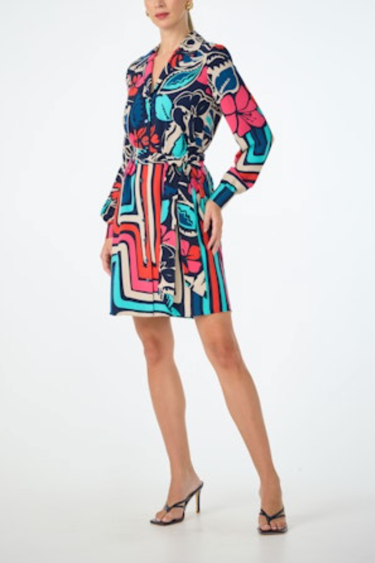The Promenade Dress combines timeless elegance with contemporary flair. This colorful printed long-sleeve mini dress features a classic collared neckline and button-up front for effortless styling versatility. The fitted waist is defined by an adjustable tie belt that cinches your silhouette beautifully. Crafted from 100% polyester, the fabric drapes smoothly while maintaining its vibrant print. Perfect for elevated casual occasions or dressed-up evenings, this piece transitions seamlessly from day to night