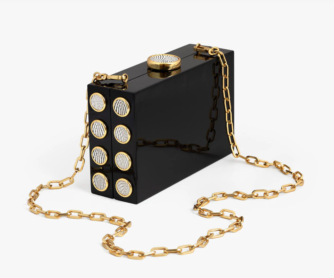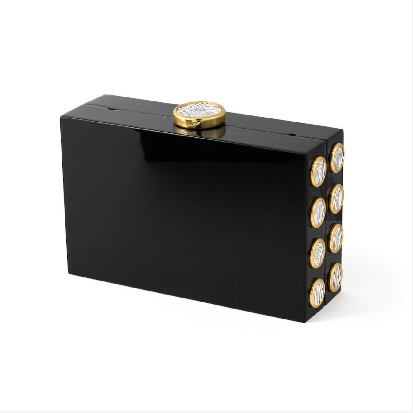 Inspired by the dynamic energy of the Basel Art Festival in Miami, the Basel Acrylic Clutch is a bold fusion of modern design and natural elegance. Featuring a sleek black acrylic shell and pheasant feathers that frame the clutch with smaller side bezels and a striking large bezel at the opening, this piece makes a statement like no other. This black acrylic clutch includes a gold chain for versatile styling and is lined with luxurious lambskin leather for added refinement. A true modern clutch, it effortlessly blends craftsmanship and contemporary style, perfect for art shows or elegant evenings.