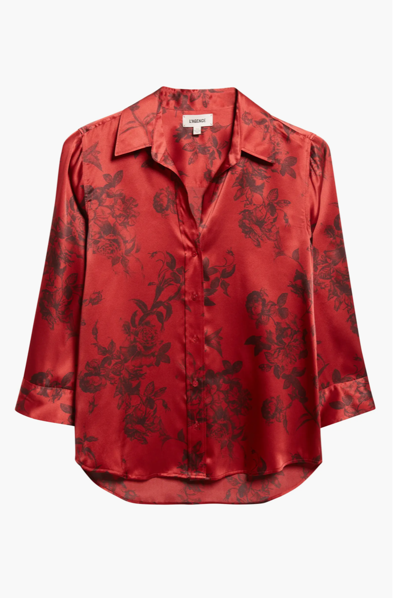 Tumbling roses bring moody romance to a button-up shirt made of cool silk with three-quarter sleeves and a graceful, relaxed drape.