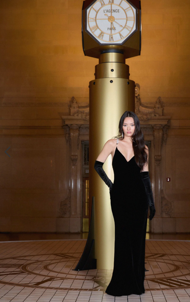 This style was featured in our Fall ‘25 NYFW presentation. The Saint dress delivers sophistication with a high-impact finish. Crafted from rich black velvet, it skims the body in a softly flared silhouette. Crystal straps crisscross at the back, adding glamour to the minimalist design. With its deep neckline and dramatic open back, the Saint is perfect for your next event.