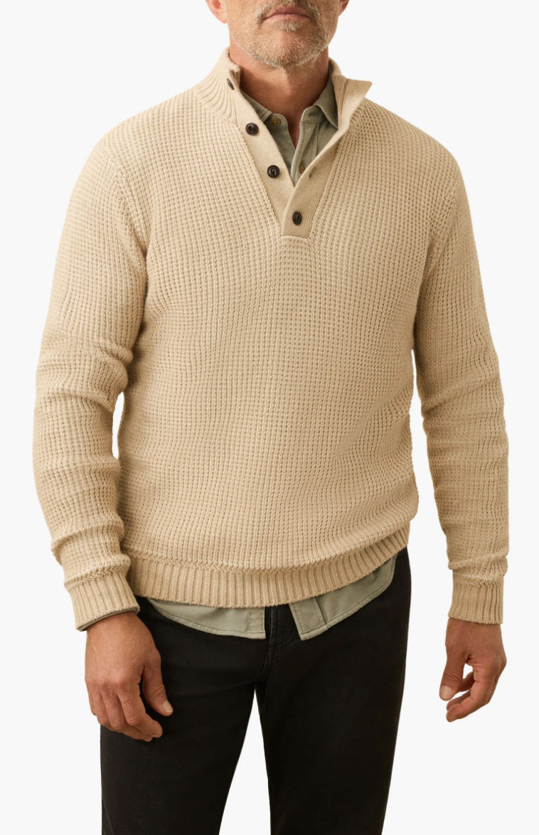 Knit from breathable organic cotton enriched with a luxe touch of cashmere, this softly textured sweater has a smart stand collar that buttons up to keep your neck cozy in chilly weather.