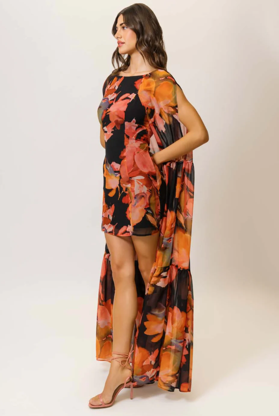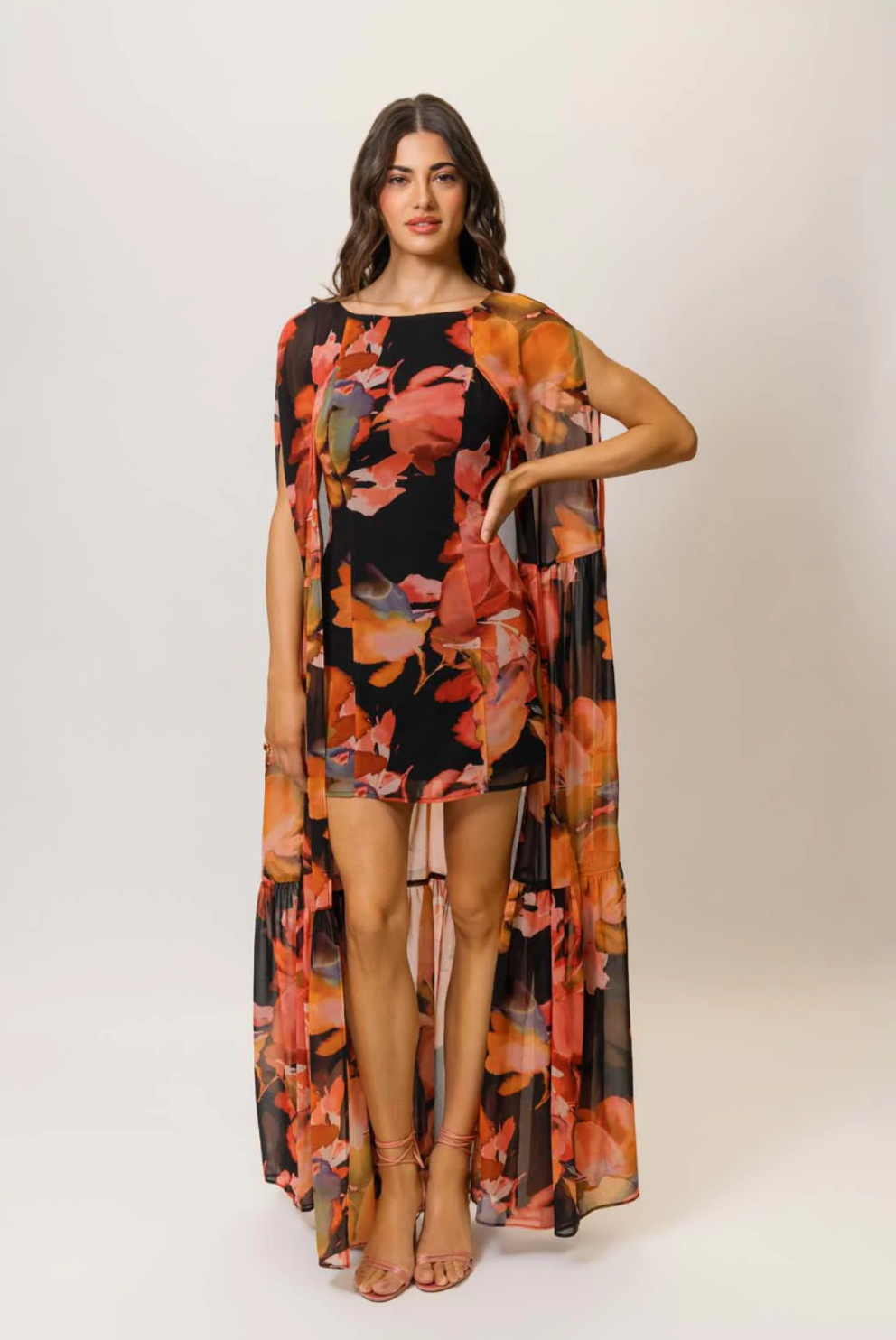 The Ailani Watercolor Floral Dress makes a striking statement with its dramatic cape-style design. Crafted from flowing chiffon, the attached multi-tiered cape creates movement and dimension, while the classic boat neckline offers timeless sophistication. A center back zipper ensures a seamless fit. This mini dress balances theatrical flair with wearable elegance, making it an exceptional choice for events where you want to stand out with refined style.