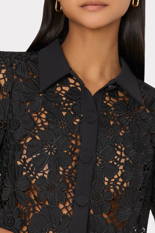 Rendered from stunning embroidered floral lace, this boxy button-up collared top features a slim-fitting short sleeve and is finished with covered buttons to close.
