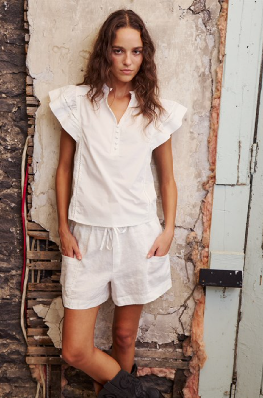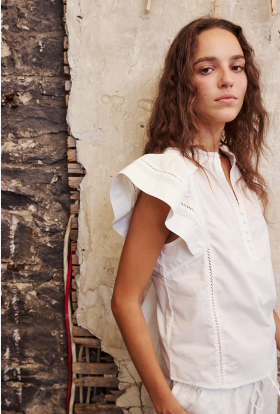 Mixed media blouse featuring dramatic flutter sleeves and intricate ladder-stitch detailing. A split V-neckline with a delicate button-front placket and gathered shoulder accents creates a structured yet feminine silhouette.