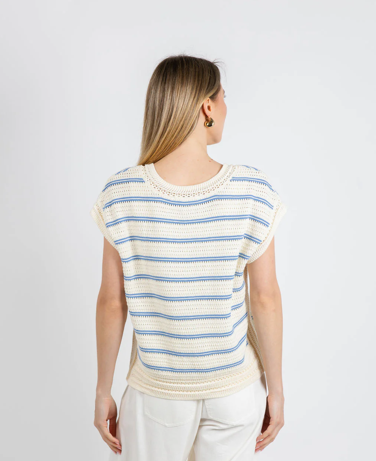 Striped sweater featuring a relaxed split neckline with intricate open-stitch detailing. Designed with extended shoulder sleeves and a textured knit construction, it offers a breezy yet structured silhouette.