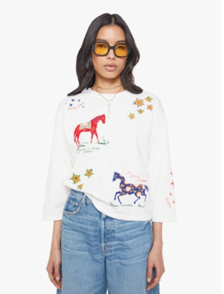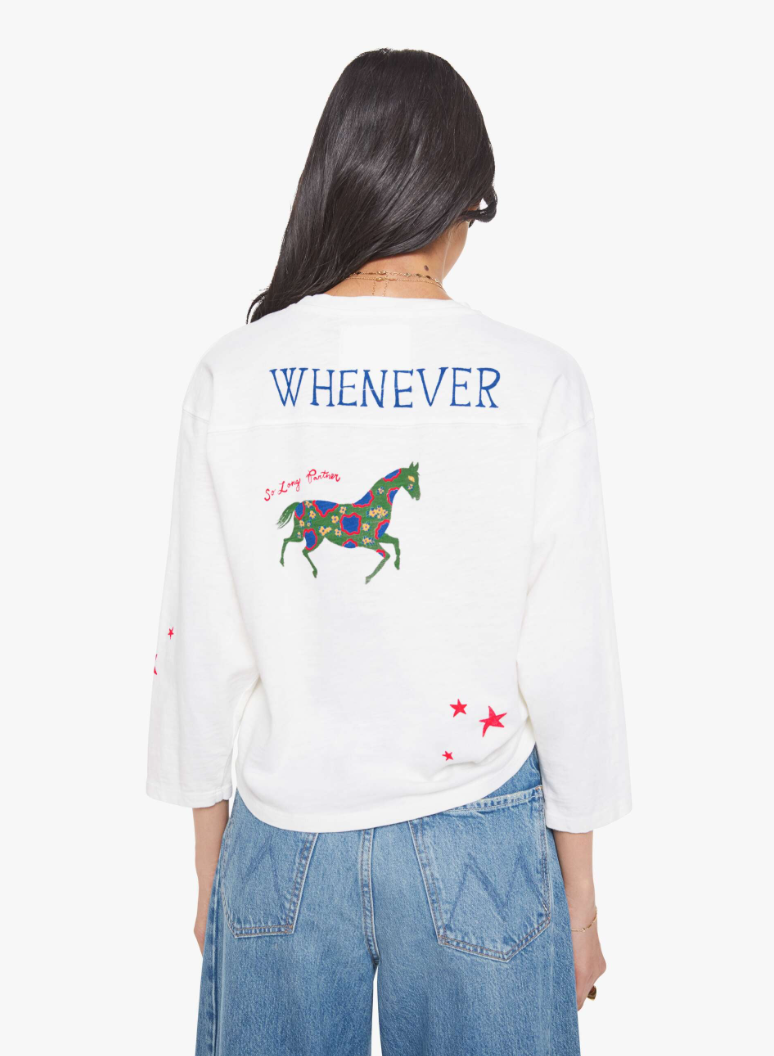 Free spirit. Inspired by a football jersey, this oversized crewneck tee is designed with drop shoulders, 3/4 sleeves and a boxy fit. Made from 100% cotton in white, The Footballer in Whenever features horse and flower graphics throughout and text in blue on the back.