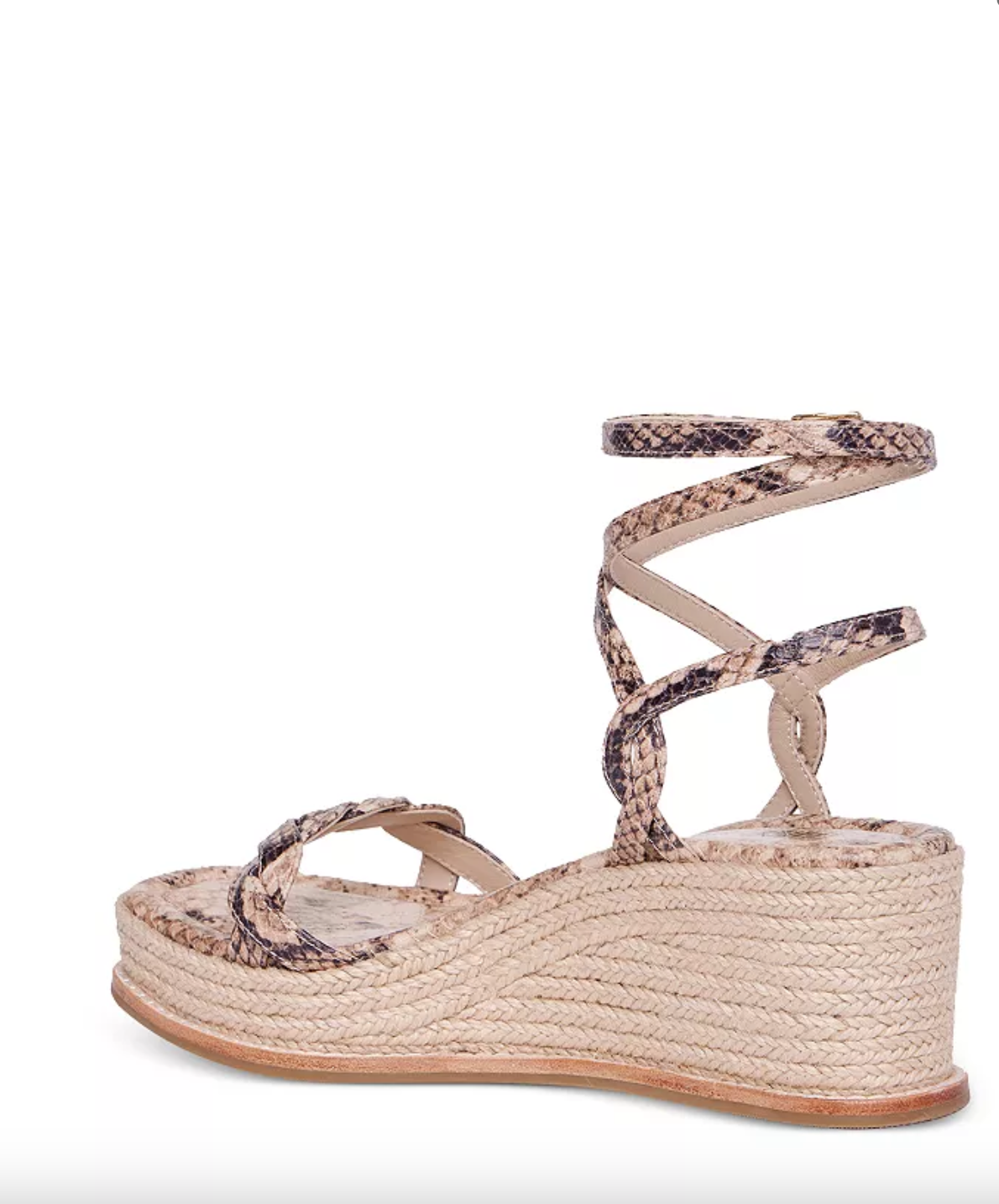 An update to our best-selling wedge sandal, Joanna features interlocking python leather straps for a chic, modern look. A double-wrap ankle strap with a light gold metal buckle closure ensures a secure fit, while the extended smooth leather welt with stitch detailing adds refined polish. The fully padded insole and genuine natural jute-wrapped wedge with a natural ribbed rubber outsole ensures all-day comfort and traction.