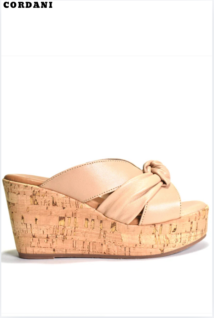 Three-banded soft leather upper with knot detail. Cork wrapped wedge. Leather lining. Lightly padded leather footbed. Synthetic sole. Made in Italy