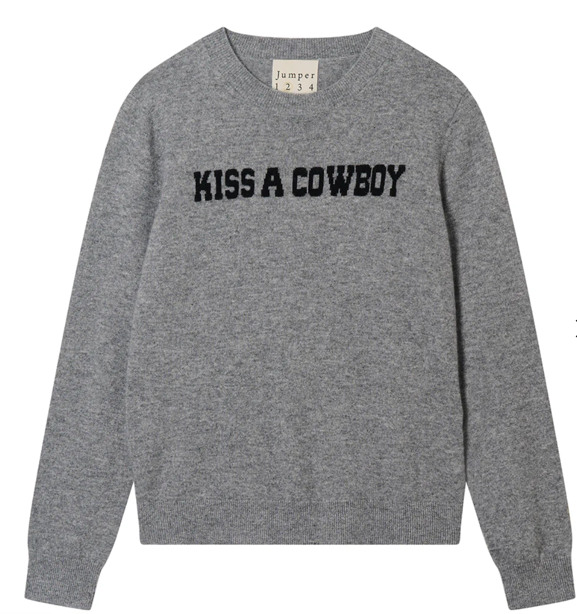 Jumper 1234 cashmere jumper. Mid grey crew neck jumper with black 'kiss a cowboy' intarsia. A little bit tongue in cheek, a lot Jumper 1234!