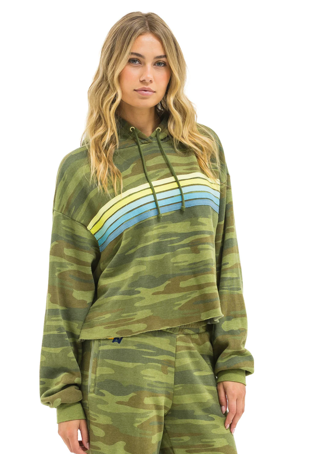 Aviator Nation 5 Stripe Relaxed Cropped Pullover Hoodie Camo/Lime/Aqua