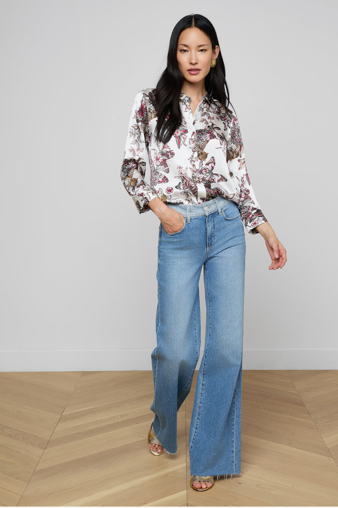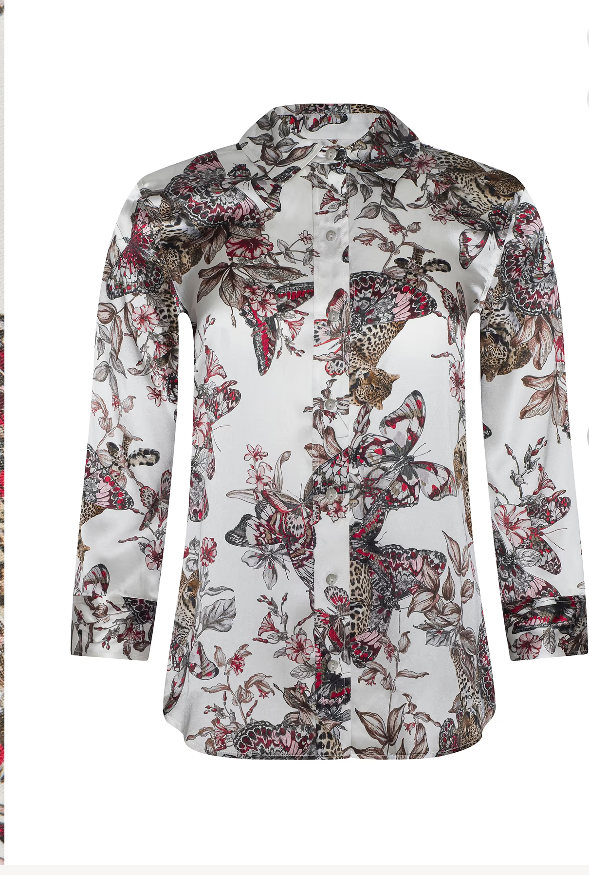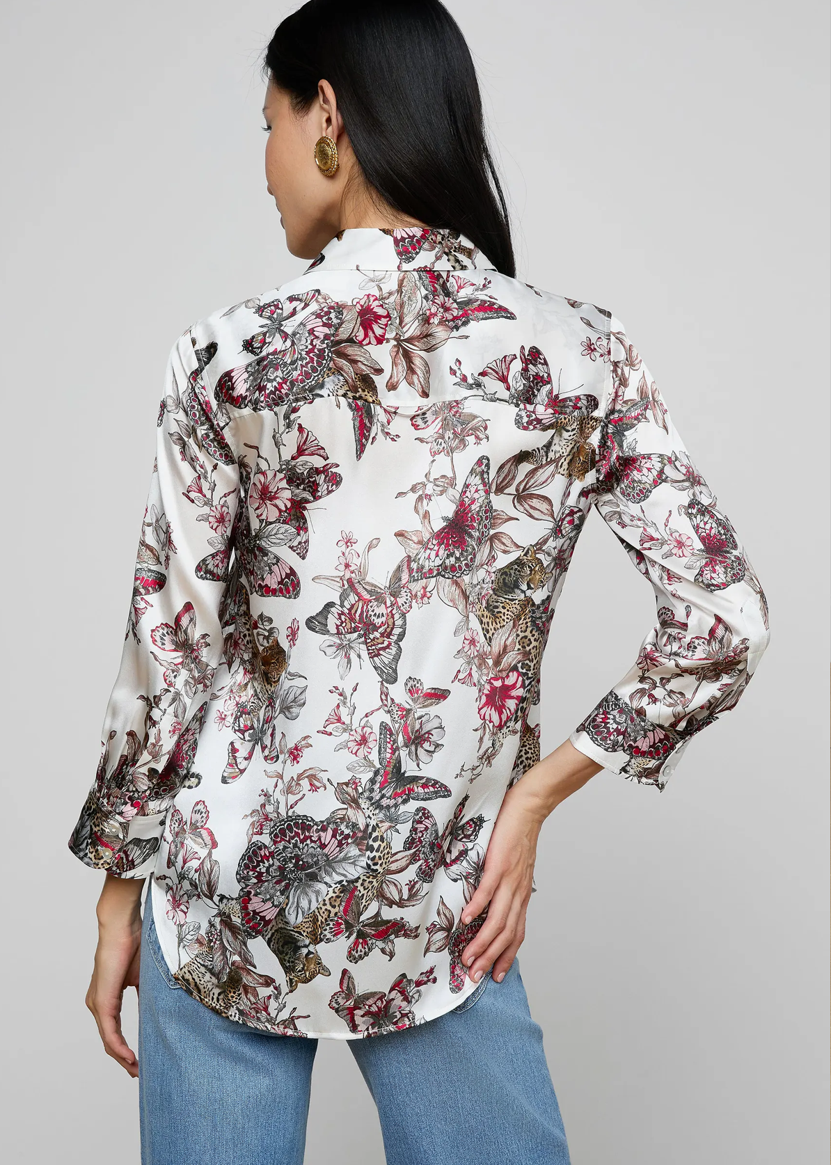 The iconic silk button-down that belongs in every wardrobe. This all-time bestseller is constructed with three-quarter length sleeves designed to perfectly showcase your jewelry—no sleeve rolling required. Our signature Dani blouse is back in a butterfly jungle print.