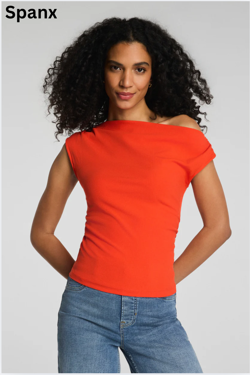 Elevate your everyday with our SPANX® Ribbed Knit Ruched Off-The-Shoulder Top. Made from ultra-soft, ribbed knit fabric with romantic, on-trend details, this top is the perfect staple piece to style with your favorite SPANX jeans, ponte pants, and everything in between.