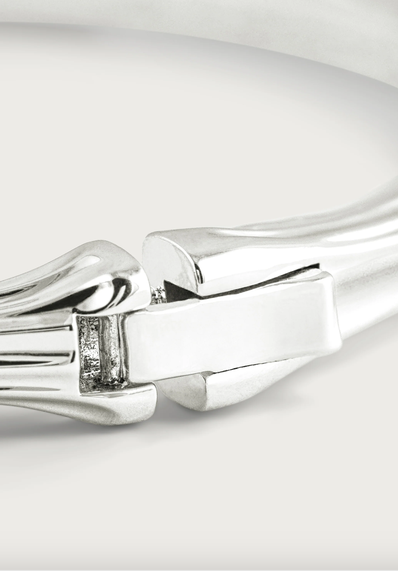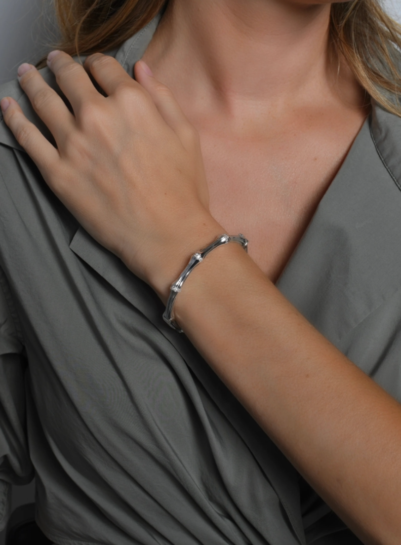 Elevate your everyday looks with the radiant allure of this bamboo hinged bangle, a testament to timeless sophistication. Crafted from sumptuous sterling silver-dipped brass, the bangle is sculpted to perfection, adorned with sparkling crystals that catch the light with every movement. Its secure hidden clasp, reminiscent of the finest jewelry craftsmanship, ensures both elegance and ease of wear, making it a refined accessory for any occasion. In the realm of accessories, this bamboo hinged bangle stands out as an exceptional piece of artistry. The intricacy of the sculpted design and the shimmering crystals culminate in a perfect union of glamour and versatility. The hidden clasp adds an element of mystery and refinement, making this bangle a stunning addition to your collection. Whether paired with casual or formal attire, it promises to be the perfect touch of sophistication, adding a radiant sparkle to your daily ensembles.