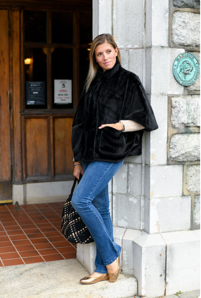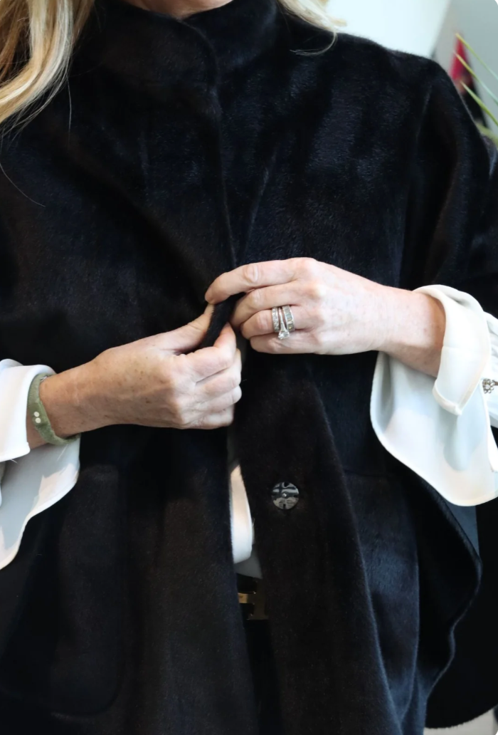 Step into effortless sophistication with The Audrey, a stunning fusion of a cape and poncho designed to be effortlessly chic. Crafted from lightweight faux fur, this piece offers unparalleled softness and warmth without compromising on style. Thoughtfully designed with buttons to keep it perfectly in place, The Audrey features large, functional pockets for added practicality and a sleek, high collar.  The perfect layering piece- whether casual or elegant.