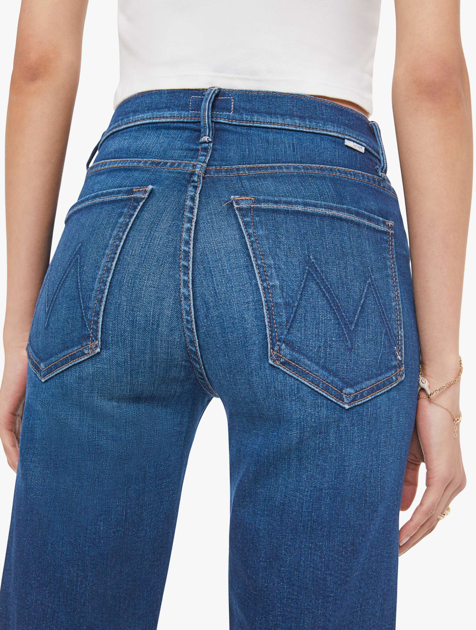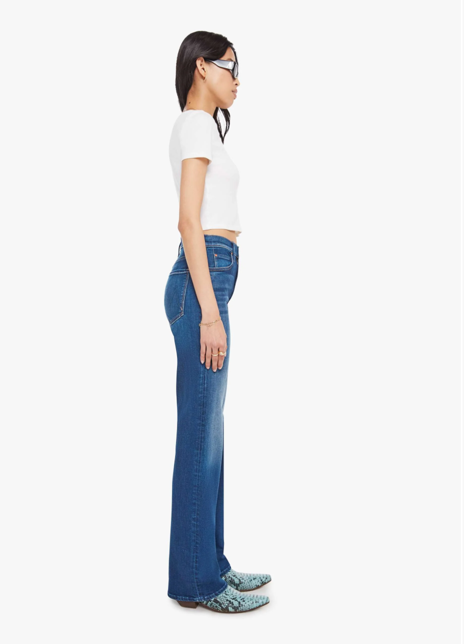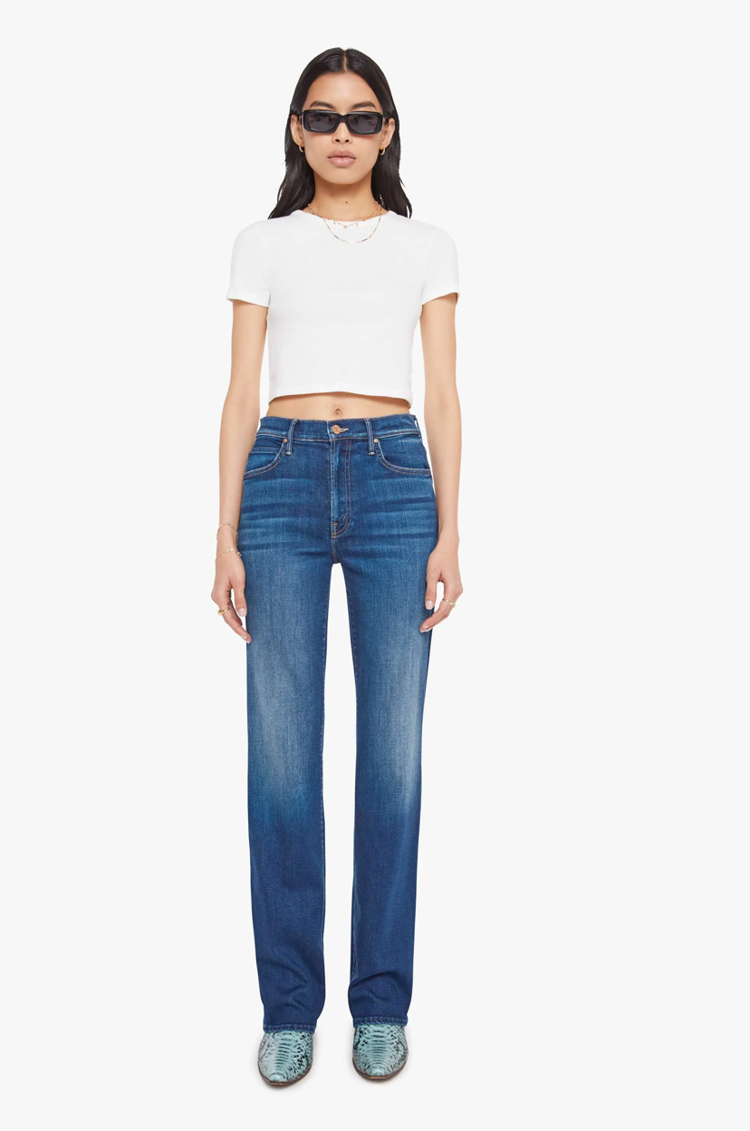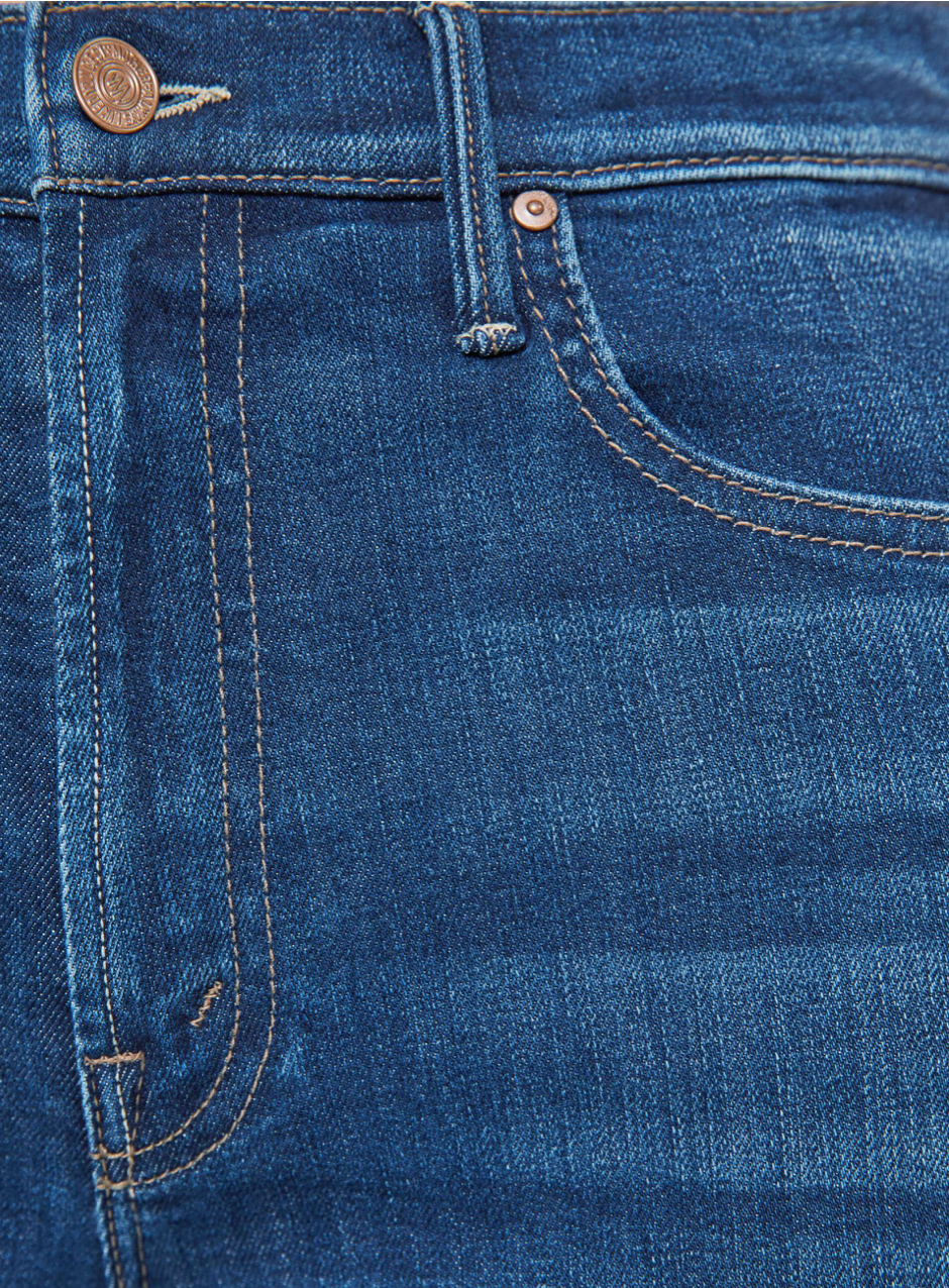 Up to no good. A high-rise straight-leg jean with a zip fly, 32-inch inseam and a clean hem. Made from a blend of recycled stretch denim, Troublemaker is a mid-blue with whiskering and fading at the knees.