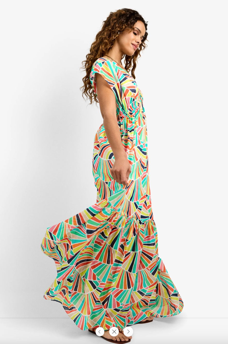 The dramatic silhouette of this maxi dress makes it the perfect piece for all your summer evening outings. A tiered hem gives this breezy maxi dress a flowy fit that moves gracefully with you, while its V-neck with an elastic waist flatters you. This dress is made of airy cotton voile in a colorful, retro-inspired print that will put you in a sunny state of mind.
