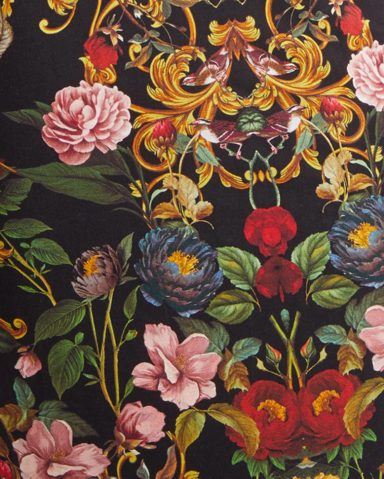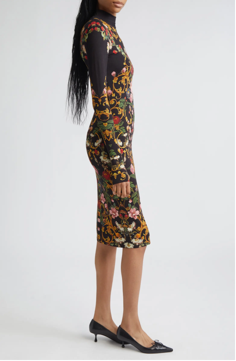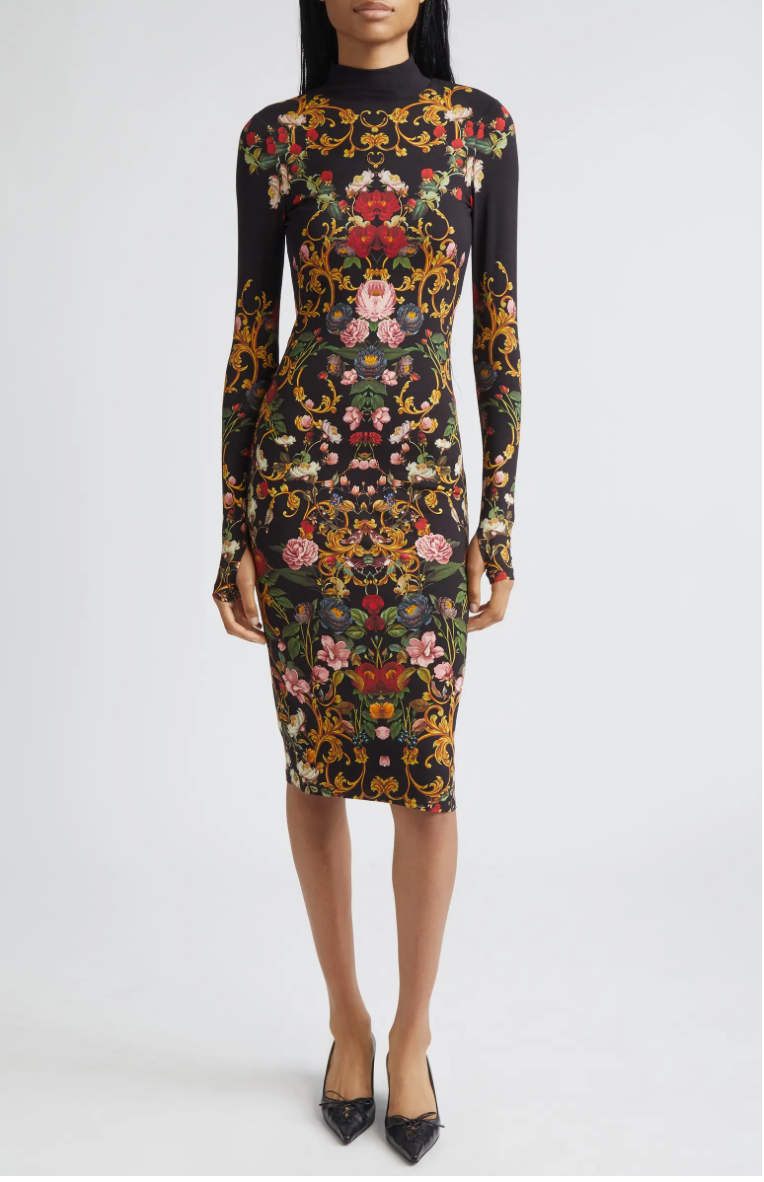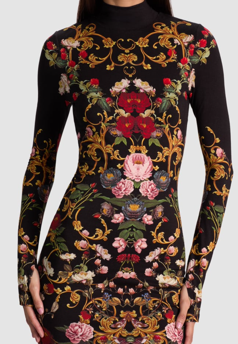 A garden of vibrant blooms patterns this stretchy body-con dress, creating a statement look that hugs your curves in all the right places. A fresh take of our cult-favorite Delora, this version arrives in printed stretch jersey with a brocade-inspired motif. Its bodycon fit, turtleneck, and thumbhole sleeves are both sleek and cozy, balancing elegance with comfort. Ideal for all-night dressing when you want ease and impact in equal measure.