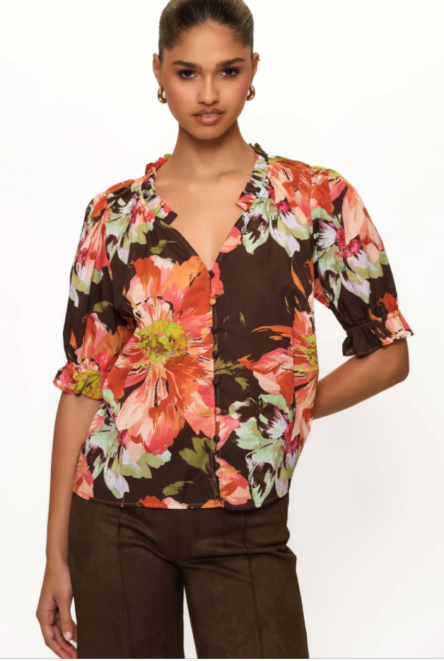 Hutch Lettuce Hem Button Down Top Brown Vintage Upholstery Floral