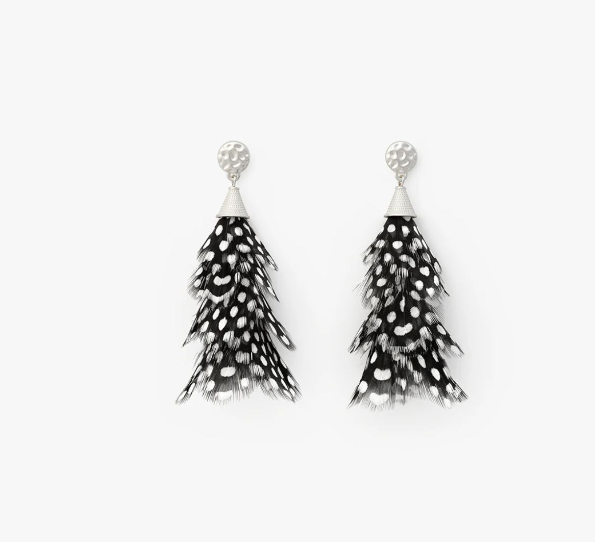 The Claudia earrings are crafted with black and white spotted guinea feathers.